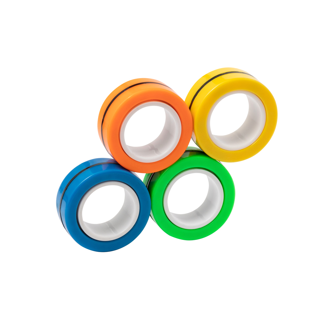 Original antiestrés en forma de anillos. Cuenta con cuatro piezas de colores con imanes para poder juntar y separar tantas veces como se quiera, liberando tensión gracias a su característico movimiento circular. Además, ofrecen la posibilidad de usarlos como spinner, ya sea juntos o por separado. Presentado individualmente en bolsa reciclada de RPET.