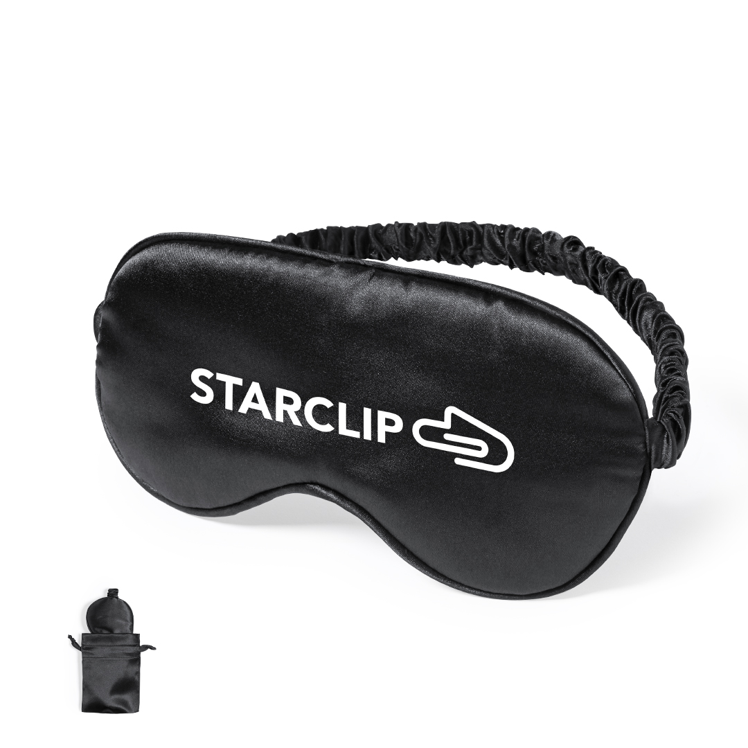 Antifaz de descanso en suave satén, con cinta elástica a juego. Presentado en bolsita individual de satén con cierre de cordón a juego.