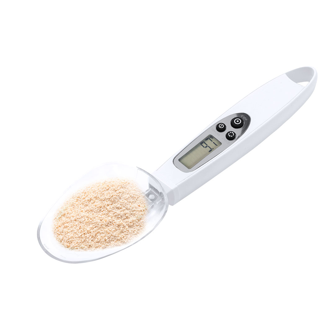 Práctica báscula digital con cuchara, válida para líquidos y sólidos. Incluye 2 cucharas intercambiables y pantalla digital LCD situada en el mango, mostrando el pesaje con una precisión de 0,1g. Botón para mostrar el peso en gramos (g), onzas (oz), o mililitros ( ml), con función de memoria y posibilidad de pesar dos ingredientes. Ambas cucharas llevan grabada una escala de medición adicional para líquidos: la cuchara pequeña desde 5 ml hasta 25 ml; y la cuchara grande desde 10 ml hasta 50 ml. Con manual de instrucciones en español e inglés. Alimentada por pila de botón (incluida) y presentada individualmente en caja de diseño kraft.