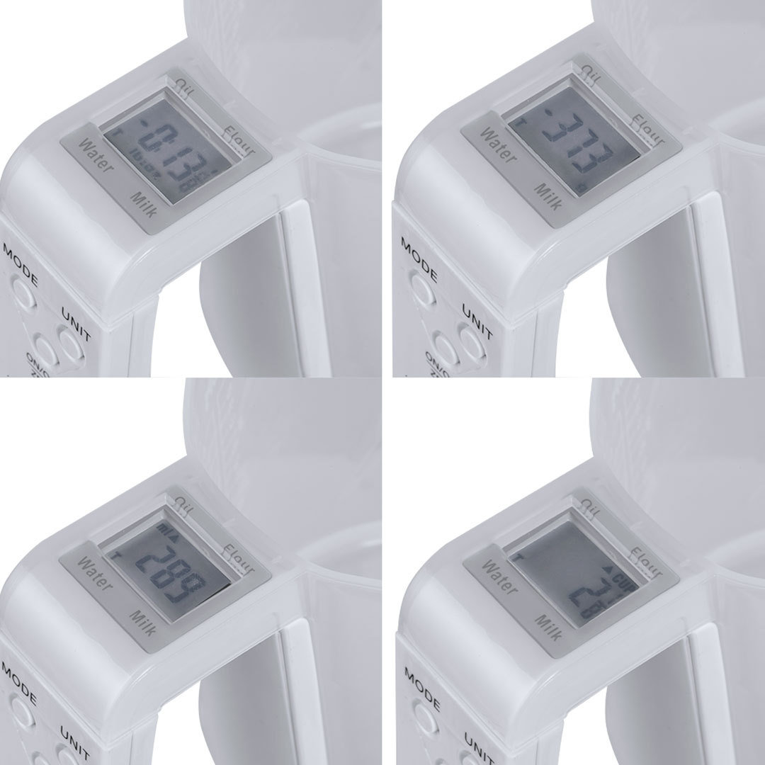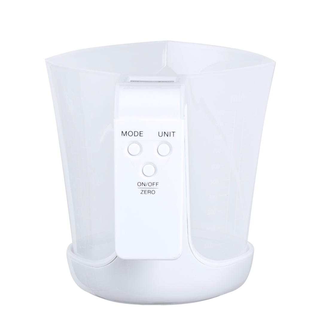 Báscula con jarra medidora integrada, fabricada en resistente combinación de PP y ABS. Pantalla LCD con control por botones y función de tara, con capacidad máxima para 5 kg de peso y válida para medir elementos líquidos o sólidos.Incluye Jarra medidora de 1L de capacidad, con multitud de opciones y vertedor para evitar derrames:-1L, con medidor lateral en tramos de 50 ml.-32 oz, con medidor lateral en tramos de 2 oz. -Medición rápida en volumen de tazas.Funciona con pila de botón (incluida) y viene presentada individualmente en caja.