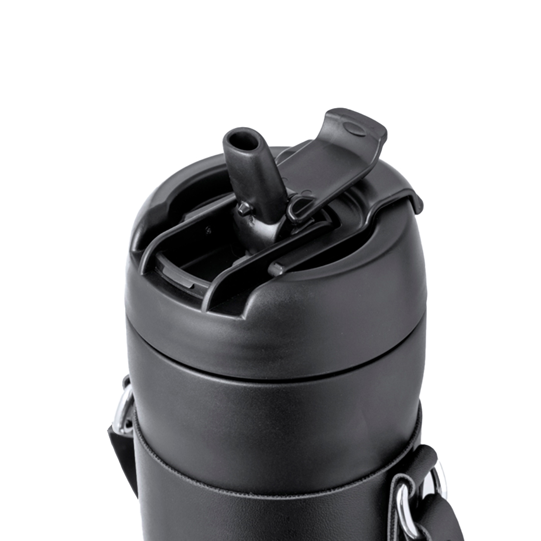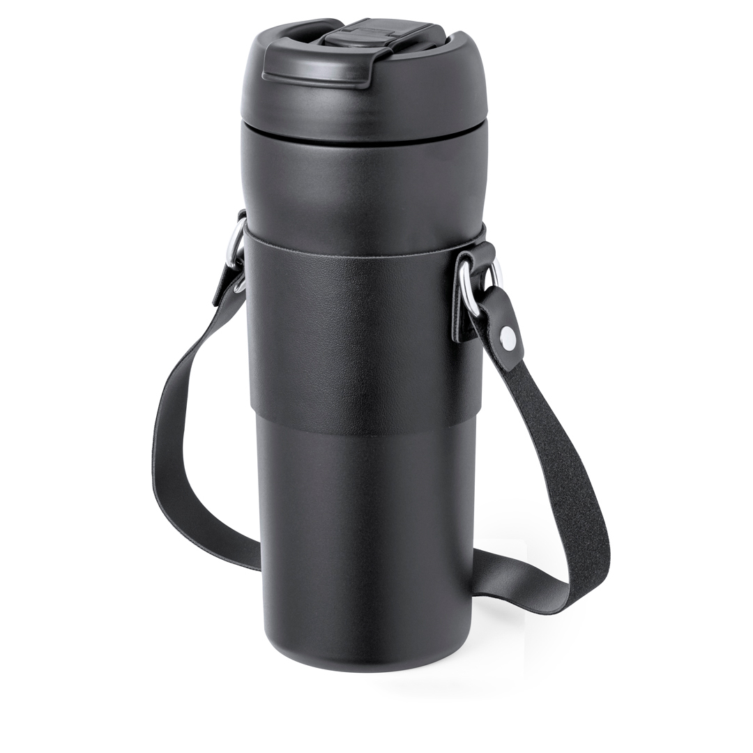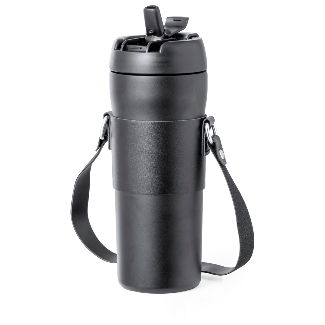 Elegante bidón térmico de 700 ml de capacidad, fabricado en acero inox de doble pared. Original tapón a rosca con dosificador en la tapa y boquilla para pajita, incluida. Con asa de transporte y agarrador a juego en polipiel. Presentado en caja individual de diseño kraft.
