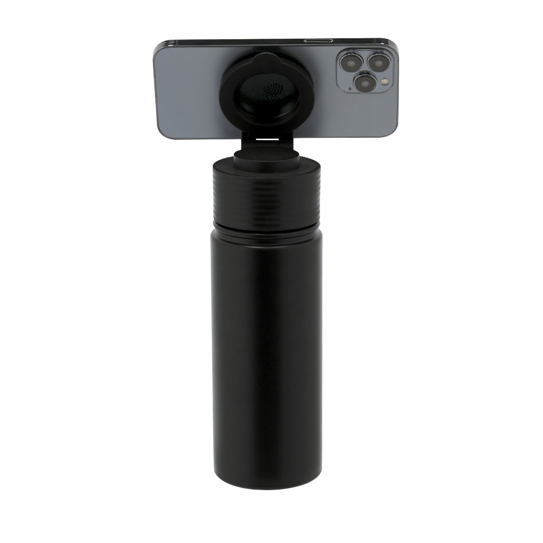 Bidón térmico con Altavoz Bluetooth 5.4 de 3W integrado. Con 500 ml de capacidad y fabricado en acero inox de doble pared, asegurando una durabilidad máxima y un excelente mantenimiento de la temperatura de las bebidas, ya sean frías o calientes. Tapadera con sistema de cierre de rosca y libre de BPA, e incluye sujeción orientable para smartphone con tecnología Magsafe. El altavoz Bluetooth de 600 mAh integrado en el tapón es fácilmente extraíble gracias a su sistema de rosca.