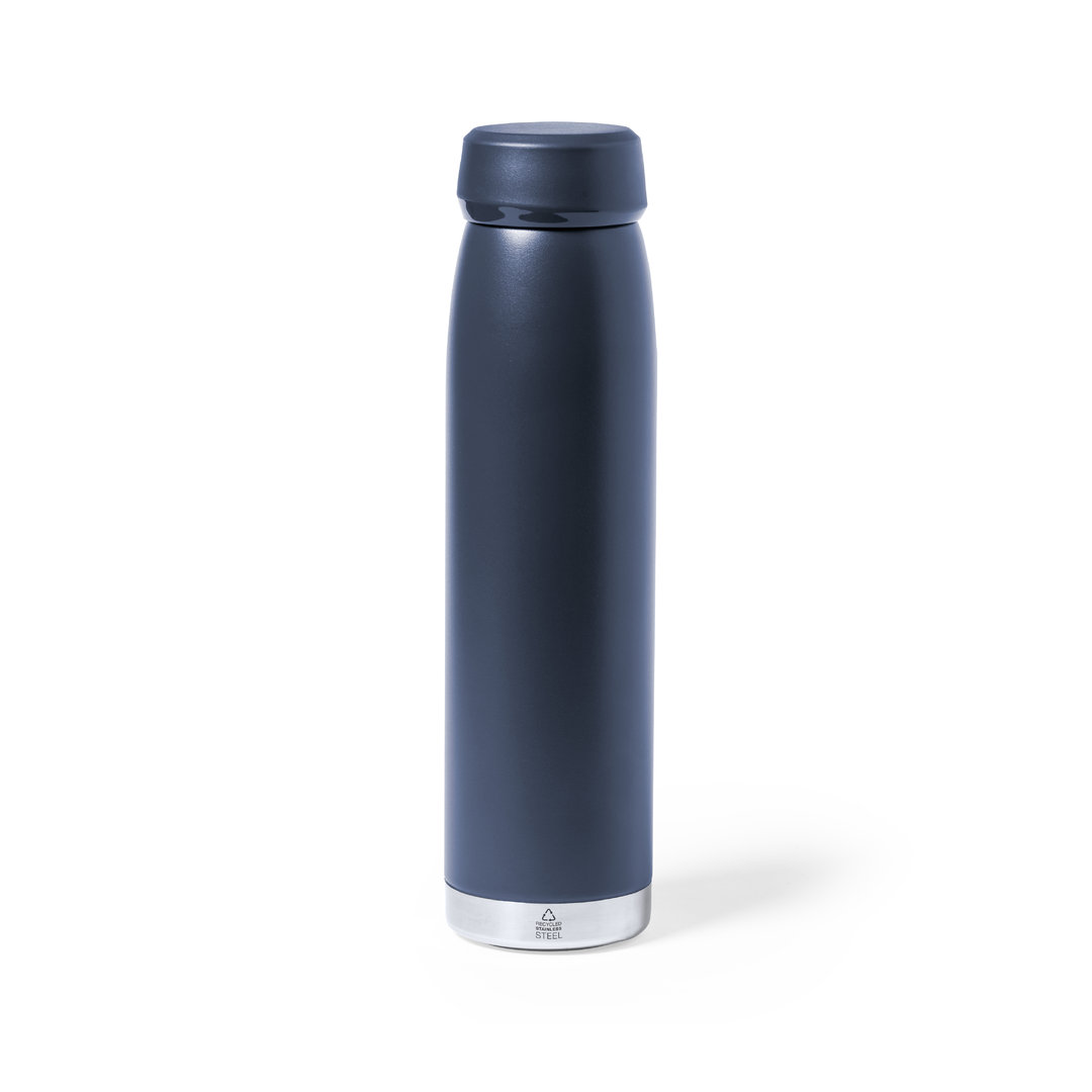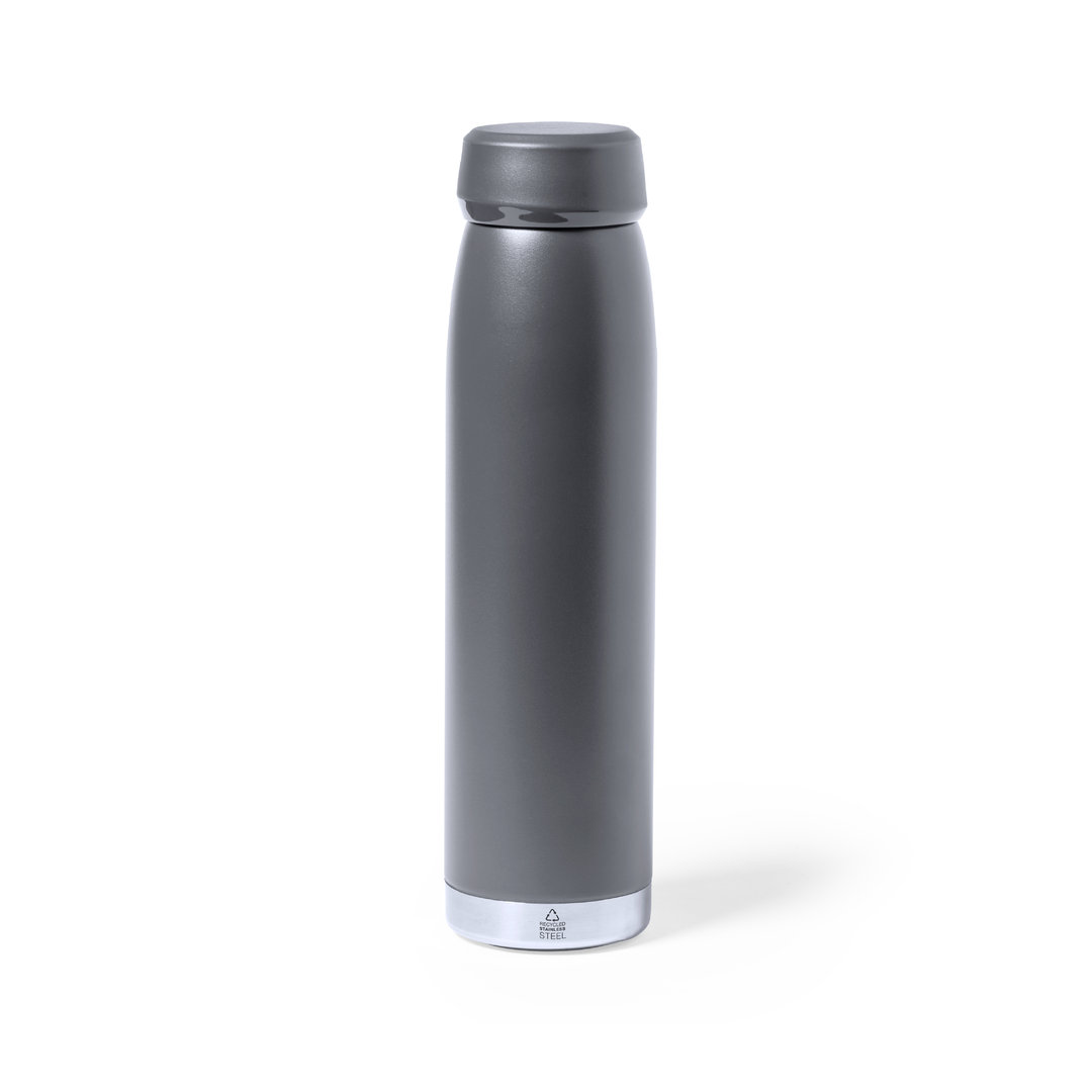 Bidón térmico de 380 ml de capacidad, fabricado en acero inox reciclado de doble pared, con tapón a rosca a juego y base en plata. Disponible en variada gama de colores satinados, libre de BPA y presentado en caja individual de diseño kraft. El acero es uno de los materiales más demandados y que puede encontrarse casi en todas partes, desde productos de uso diario a grandes construcciones. Con innumerables propiedades, entre las que cabe destacar la durabilidad y su alto grado de reutilización, convirtiéndolo en una alternativa muy valorada en soluciones de sostenibilidad. Debidamente tratado, permite obtener nuevos recursos de infinita utilización.