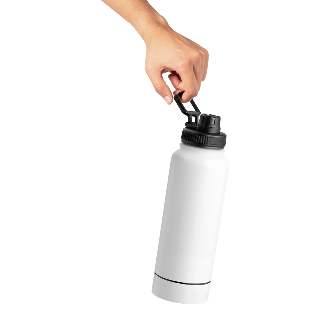 Bidón térmico de doble capa con 1L de capacidad en acero inox. Tapón de rosca de color negro con dosificador y asa de transporte. Además, en la base tiene un compartimento de rosca para guardar pequeños objetos. Disponible en elegantes colores. Presentado en caja de diseño kraft.