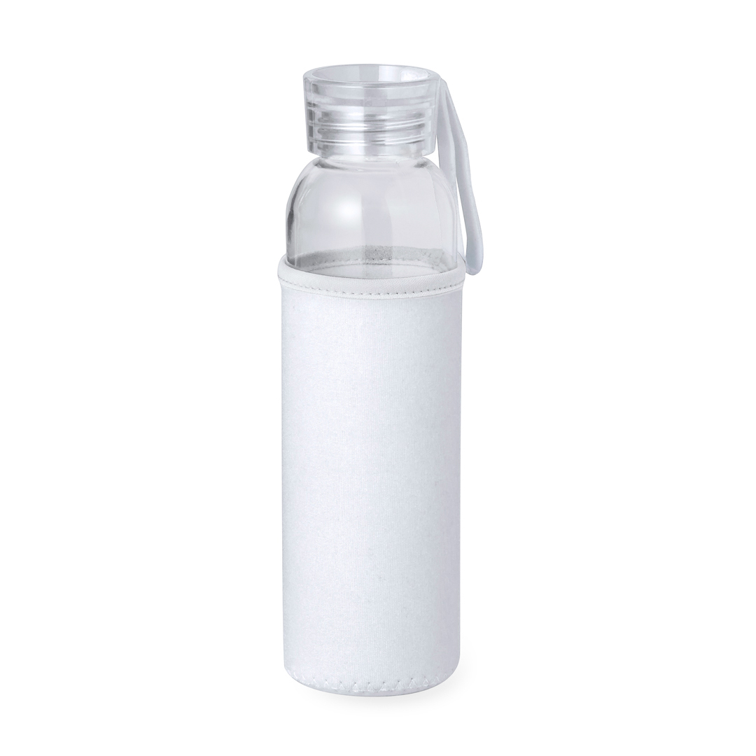 Bidón de 500 ml de capacidad. Cuerpo fabricado en cristal, con tapón a rosca y práctica asa de silicona para un fácil transporte. Incluye funda de soft shell a juego. Disponible en variada gama de colores y presentado en caja individual de atractivo diseño kraft.