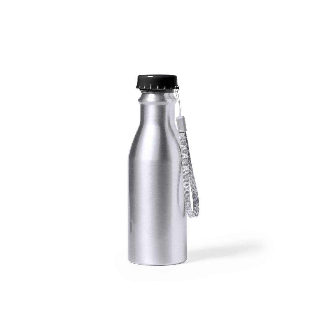 Bidón de 500 ml de capacidad, fabricado en aluminio de acabado brillo. Con original tapón chapineta en negro, a rosca y con cinta de transporte. Libre de BPA y presentado en caja individual de diseño kraft.
