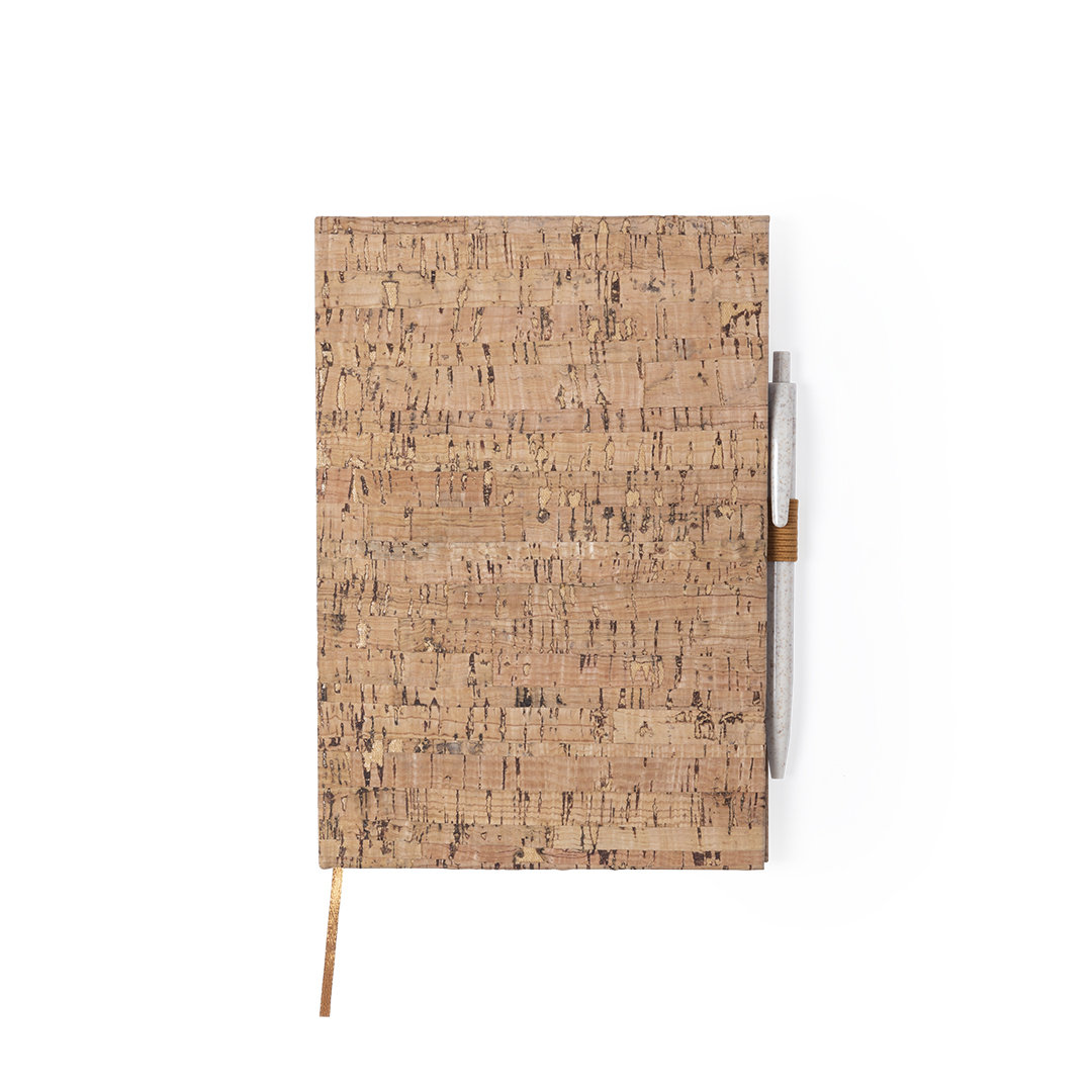 Bloc de notas de línea nature con tapas duras en corcho natural, de sobrio diseño. Incluye 100 hojas blancas lisas, con marcapáginas y soporte para bolígrafo a juego.