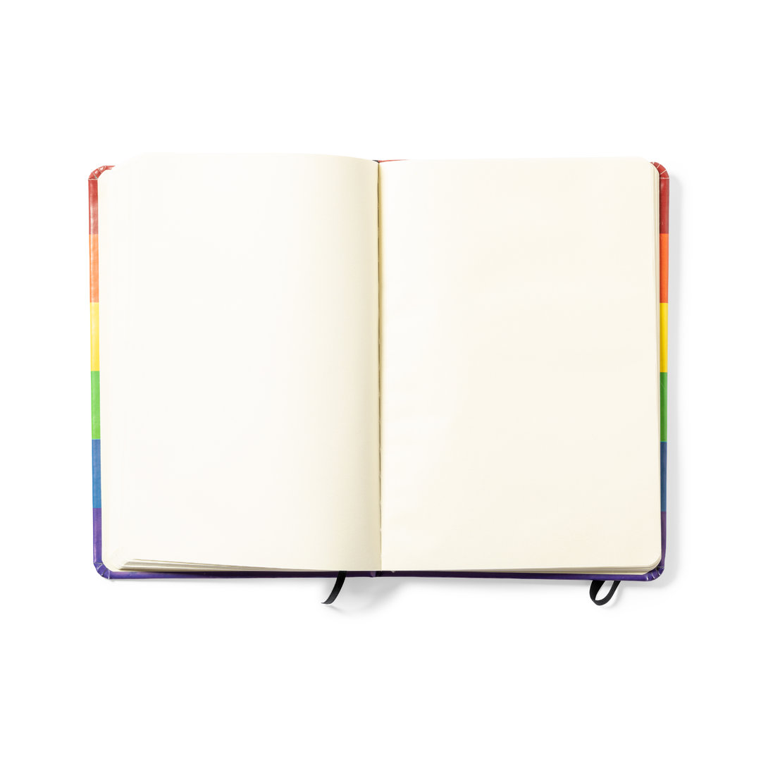 Bloc de notas Rainbow multicolor, con tapas duras en polipiel de suave tacto y elástico de sujeción. Todo un orgullo de bloc de notas, con 100 hojas interiores lisas y marcapáginas de tela.