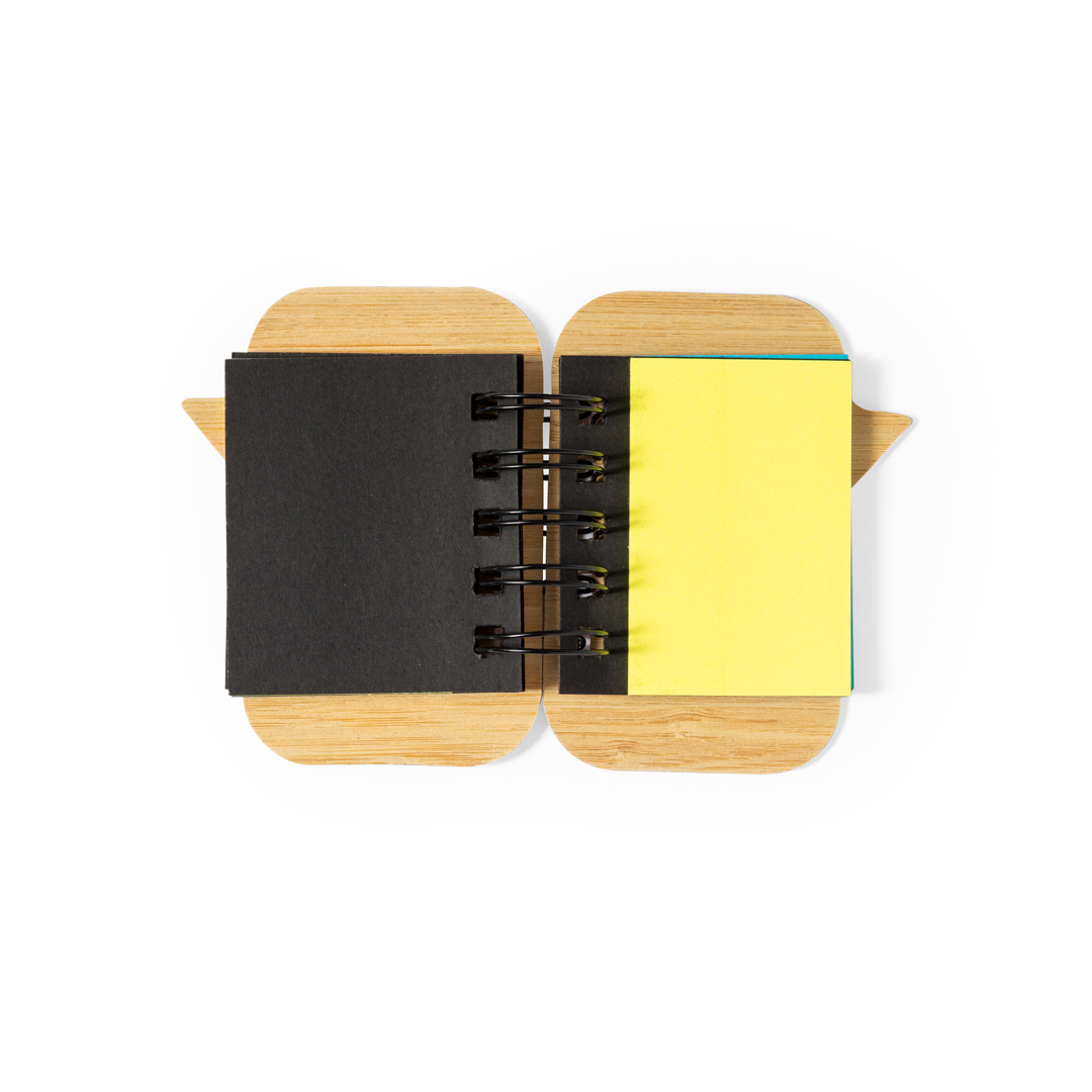 Bloc de notas con anillas y de tapas rígidas elaboradas con bambú en forma de globo speech. Interior con 25 notas adhesivas de 5×7,5cm y 125 mininotas adhesivas de 1,5x5cm en variados colores. Presentado en bolsa individual reciclada.Materiales como el bambú fomentan la utilización de materias primas naturales, reduciendo las emisiones contaminantes. Proviene de una planta de gran resistencia y versatilidad, con crecimiento y regeneración rápidos, siendo una excelente alternativa al uso de madera tradicional.