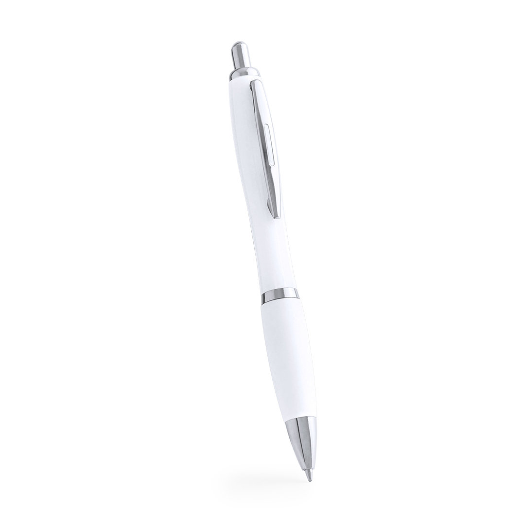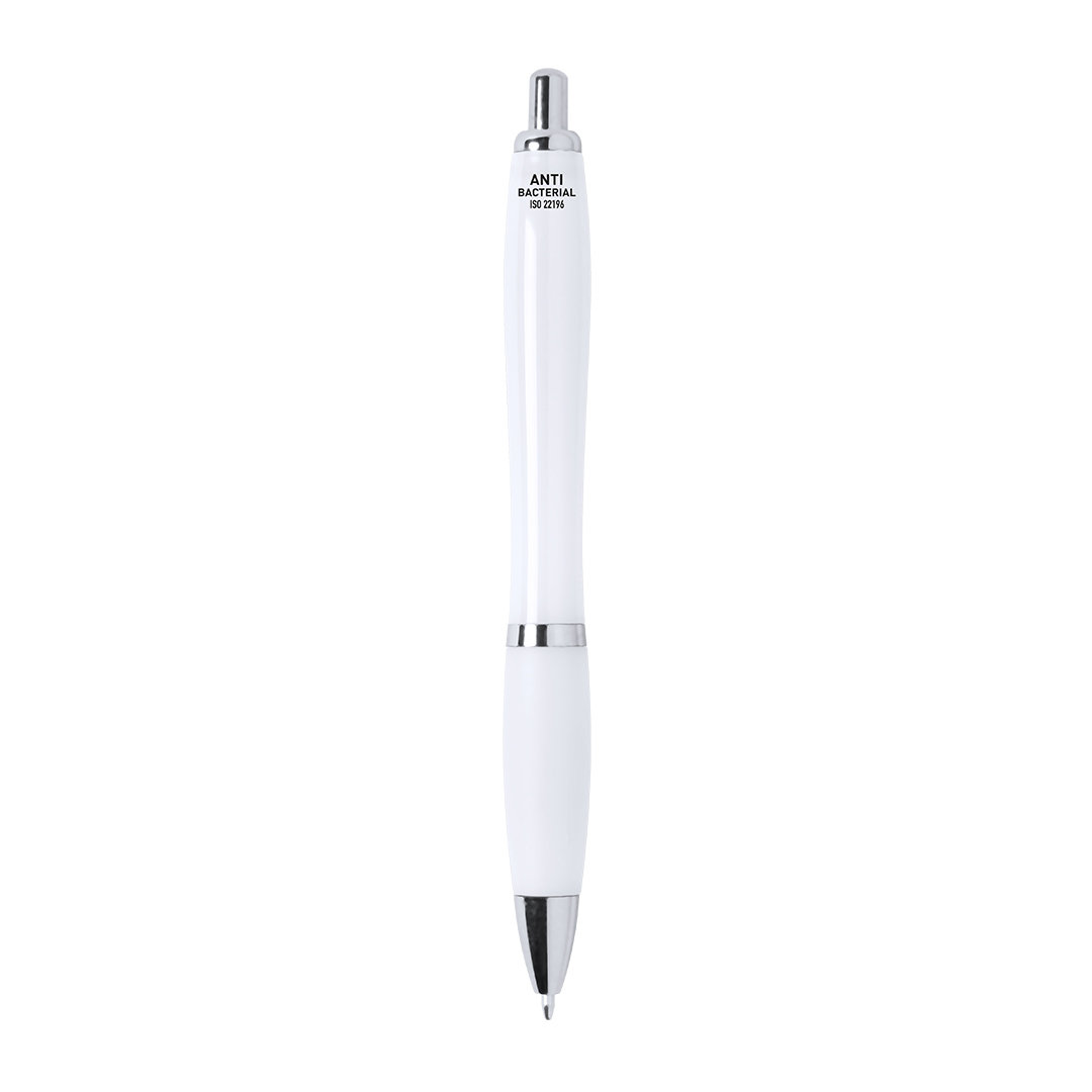 Bolígrafo antibacteriano. Fabricado en material ABS, especialmente tratado para inhibir y prevenir el crecimiento bacteriano sobre el cuerpo del bolígrafo gracias a la tecnología nano silver, un tratamiento especial realizado con iones de plata. De mecanismo pulsador, con accesorios en color plateado y cuerpo en color blanco. Clip troquelado y cómoda empuñadura, en tinta azul. Artículo de acuerdo al estándar ISO 22196:2011, sobre la medida de la actividad antibacteriana en plásticos y otras superficies no porosas.
