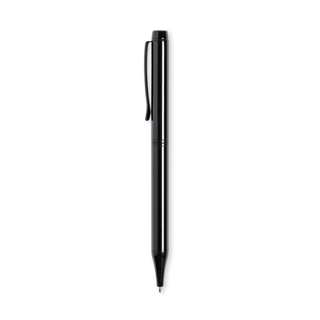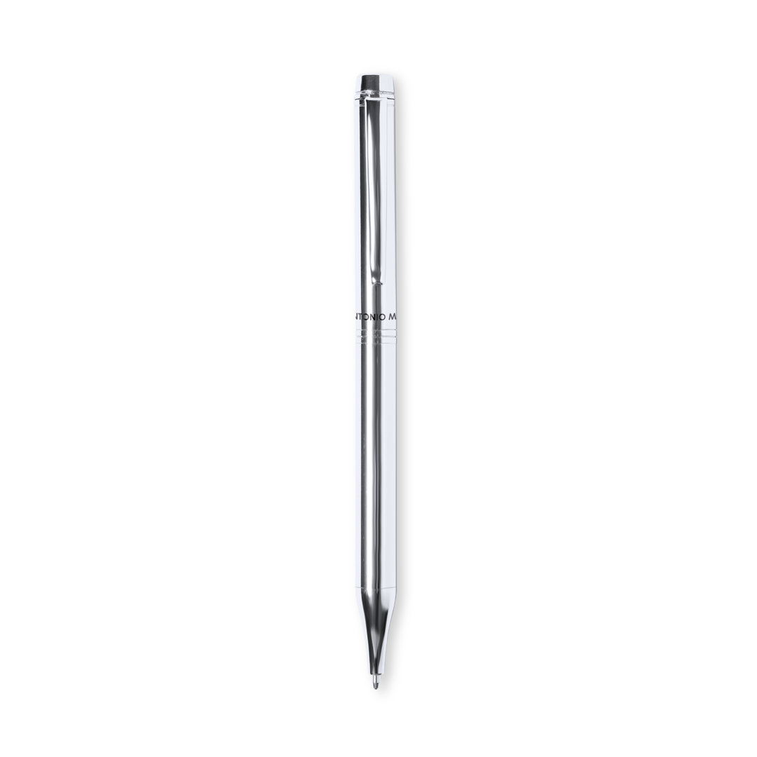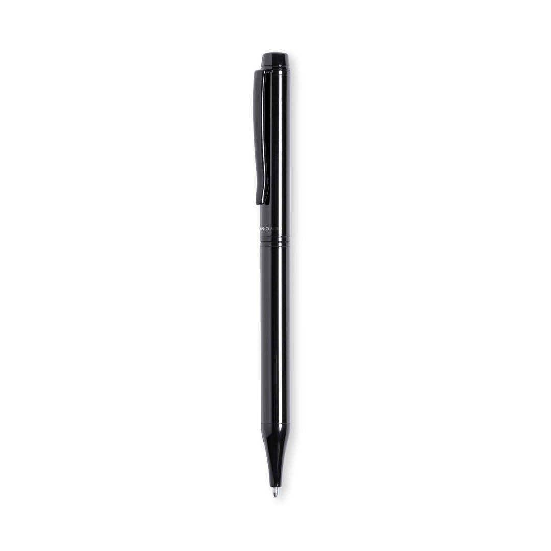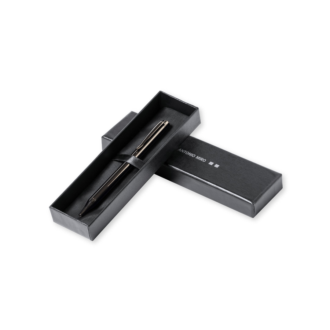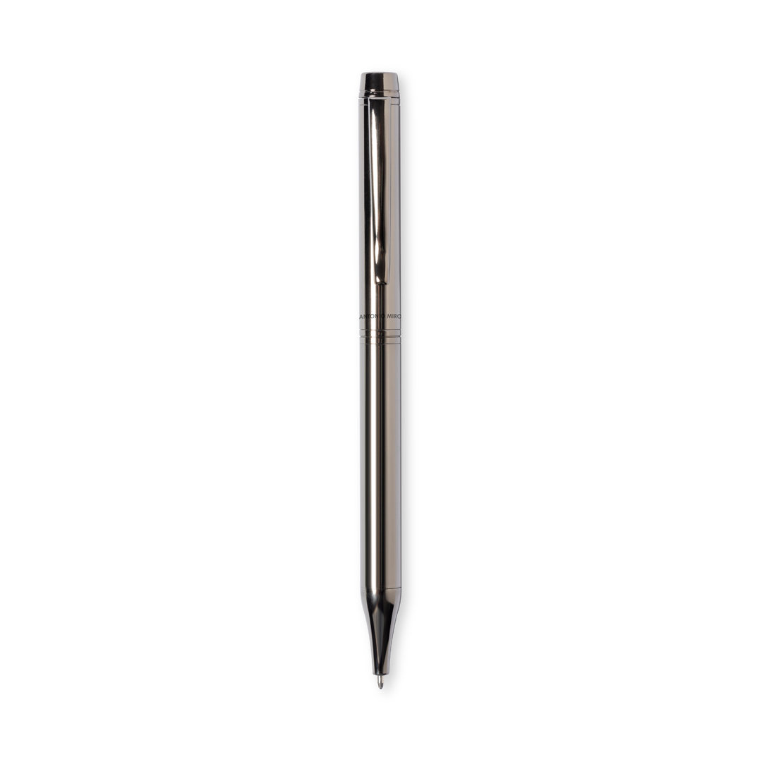 Bolígrafo de Antonio Miró fabricado en metal de acabado brillante, con logotipo de la marca en cuerpo y disponible en variada gama de colores. Con mecanismo giratorio y en tinta azul. Presentado en elegante y resistente caja individual negra con logotipo Antonio Miró y funda a juego.