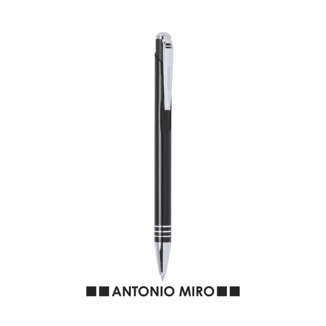 Bolígrafo de Antonio Miró de elegante diseño y suave cuerpo en aluminio con accesorios en color plateado. De mecanismo pulsador, con parte superior y troquelado en cuerpo en trama de carbono. Original clip metálico y presentado en estuche individual de aluminio negro con logotipo de la marca. Tinta azul.
