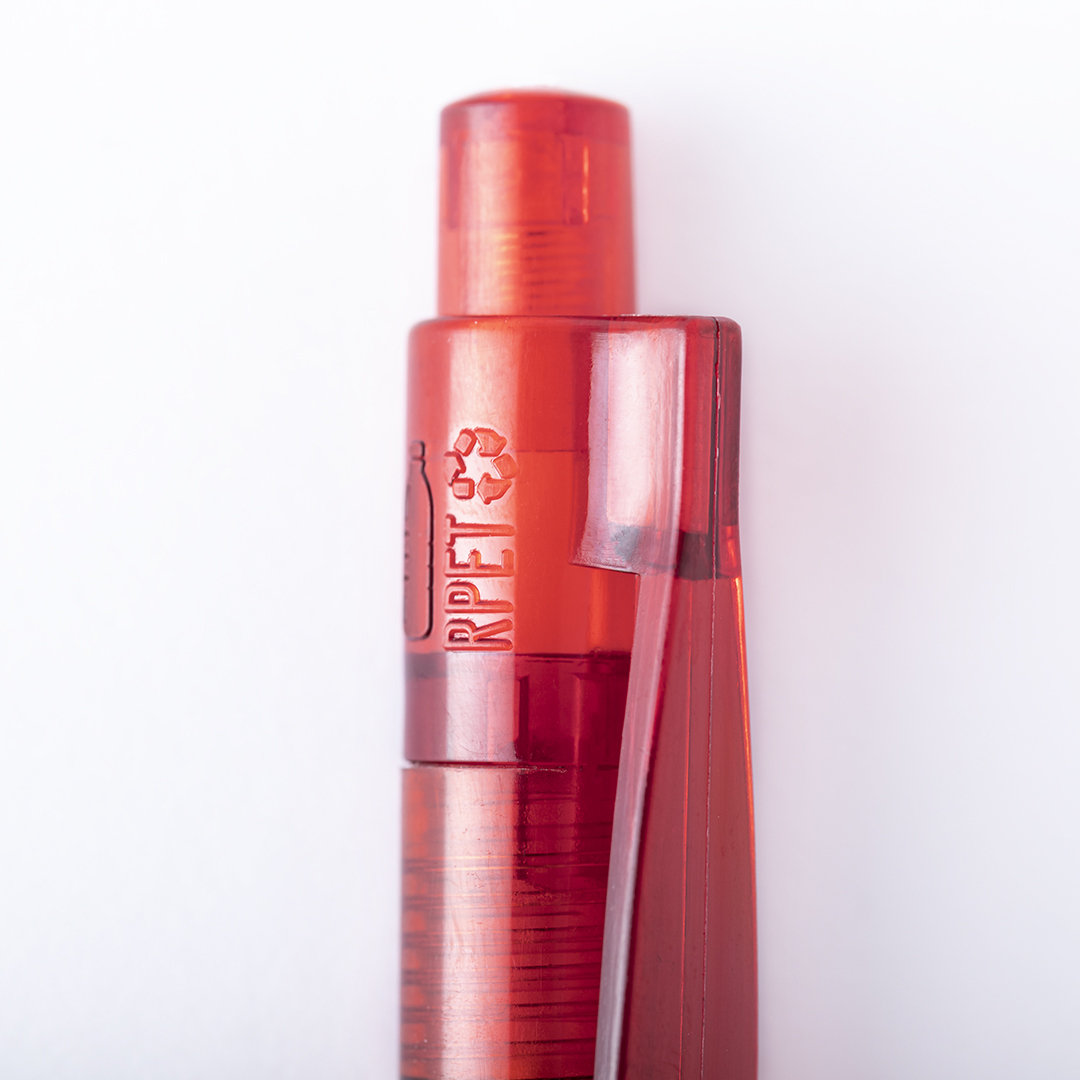 Bolígrafo de línea nature en material RPET, elaborado a partir de plástico reciclado para así fomentar la reutilización de residuos plásticos y ayudar a la sostenibilidad del planeta. De acabo translúcido y original clip, con distintivo RPET en el cuerpo del bolígrafo y disponible en variada gama de colores. Especialmente diseñado para marcaje en tampografía, de mecanismo pulsador y con tinta azul.