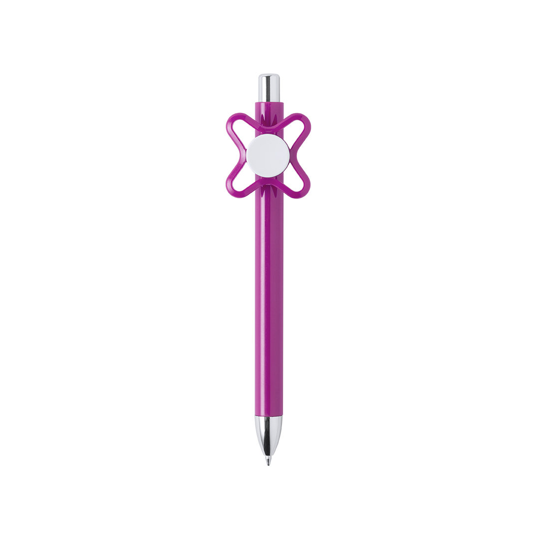 Original bolígrafo spinner antiestrés de mecanismo pulsador y divertido diseño con accesorios en color plateado y cuerpo de acabado sólido en colores brillantes. Especialmente diseñado para tampografía en clip y en cuerpo. De cartucho jumbo y en tinta azul.