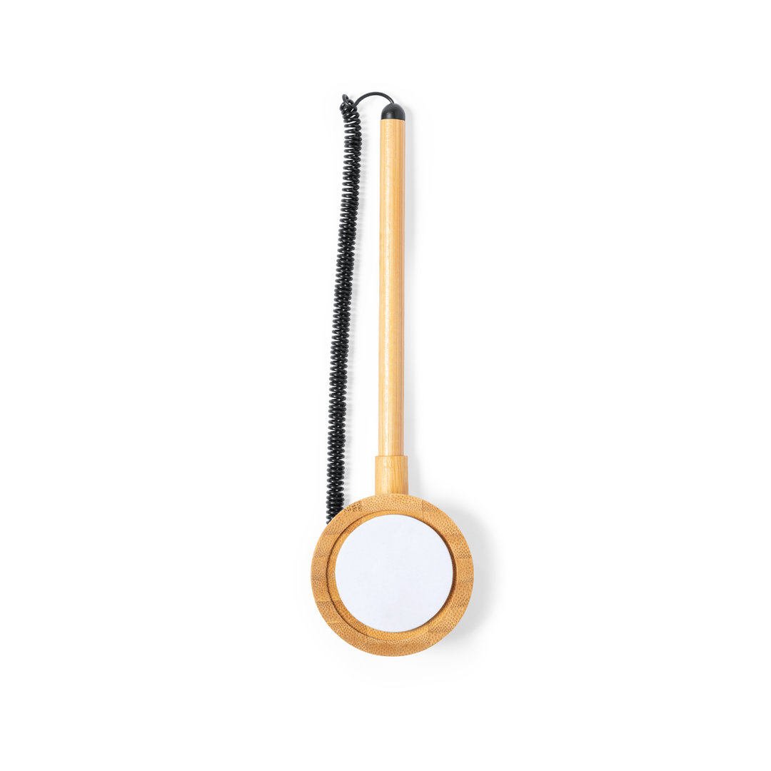 Bolígrafo de línea nature fabricado en bambú, en tinta azul y con cable extensible. Incluye soporte de bambú para el bolígrafo, con adhesivo 3M en la base, fijación extra fuerte y libre de residuos al despegarlo. Presentado en caja individual de diseño kraft.