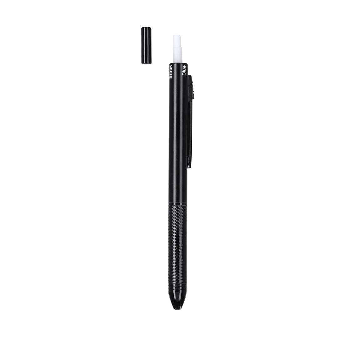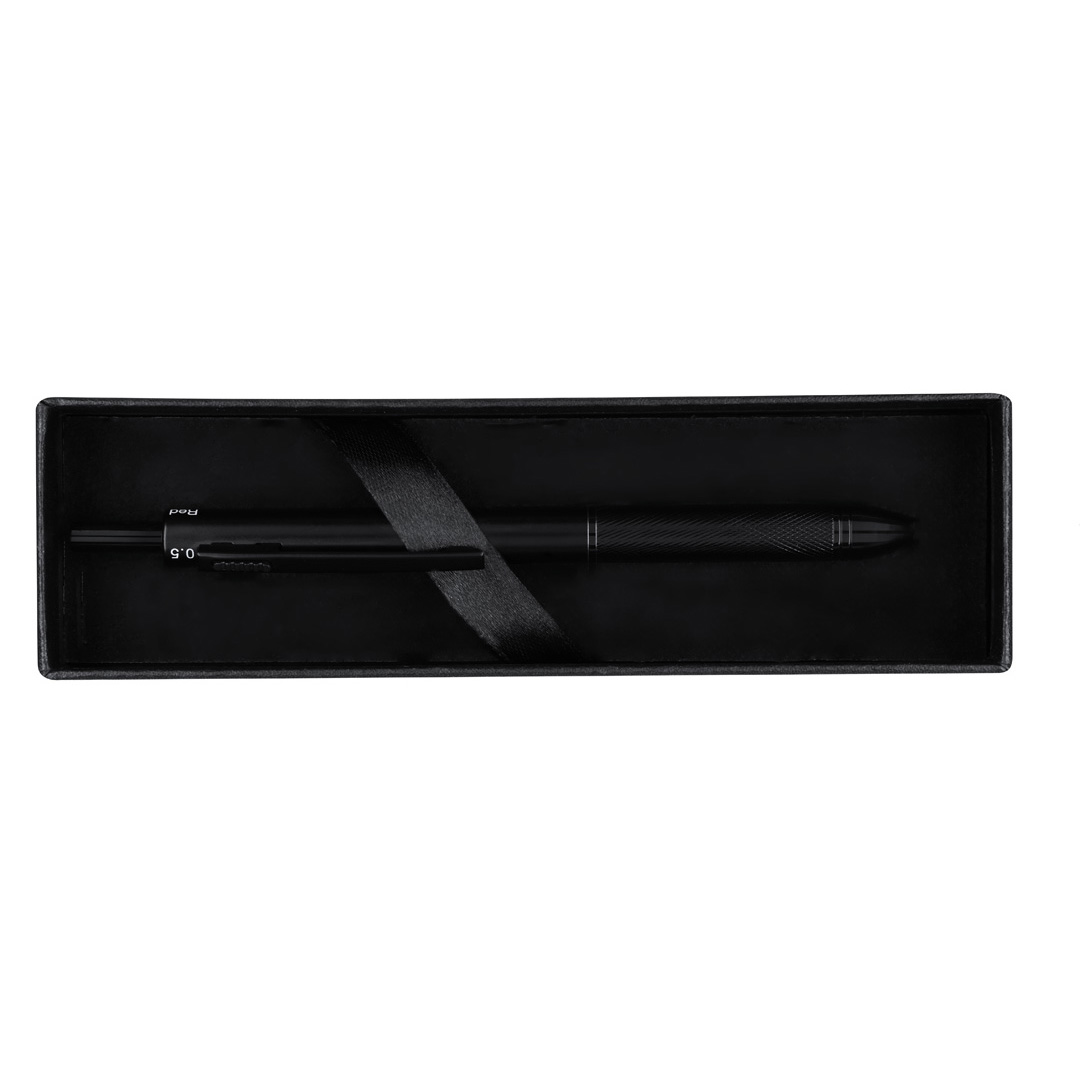 Bolígrafo portaminas 4 en 1, con ingenioso mecanismo de uso. La posición del pulsador permite seleccionar el color de la tinta o la función portaminas. Fabricado en resistente aluminio. Opciónes de tinta azul, negra y roja. Cuenta función portaminas. Incluida 1 mina de 0,5mm. Con goma integrada en el pulsador. Con empuñadura ergonómica y clip a juego.