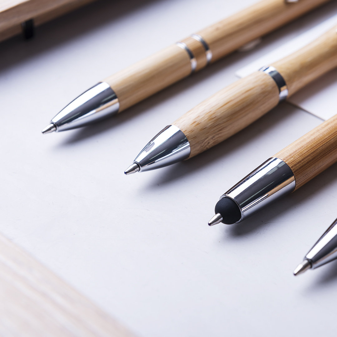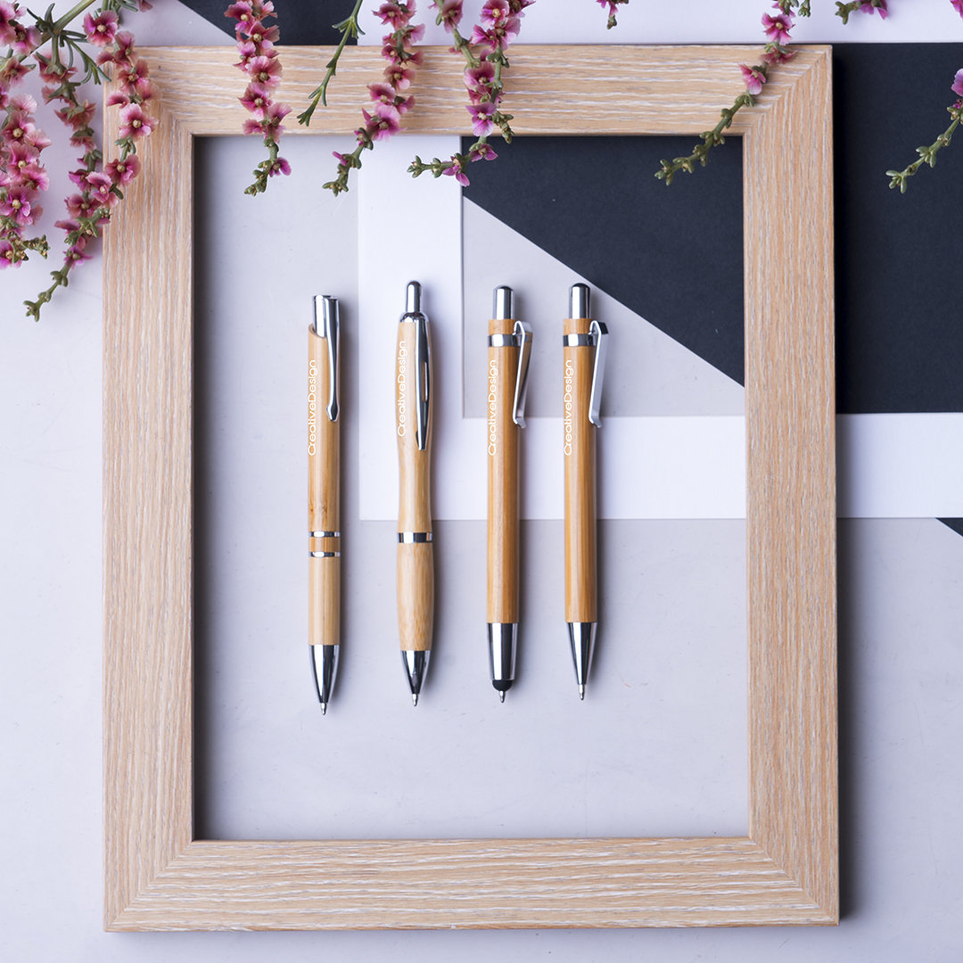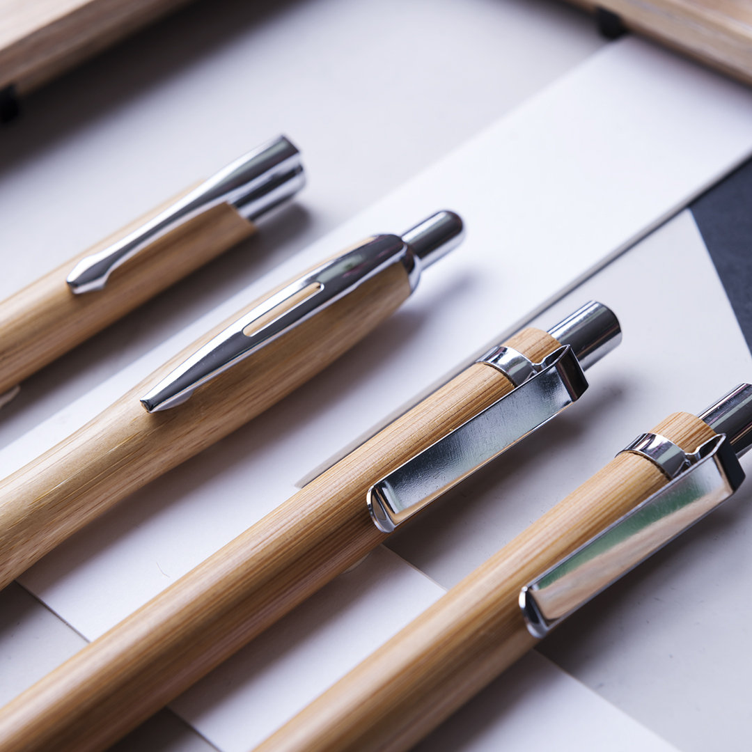 Bolígrafo de línea nature con cuerpo en madera de bambú. De mecanismo pulsador, con clip troquelado y detalles en acabado cromado. De cartucho jumbo y tinta negra.