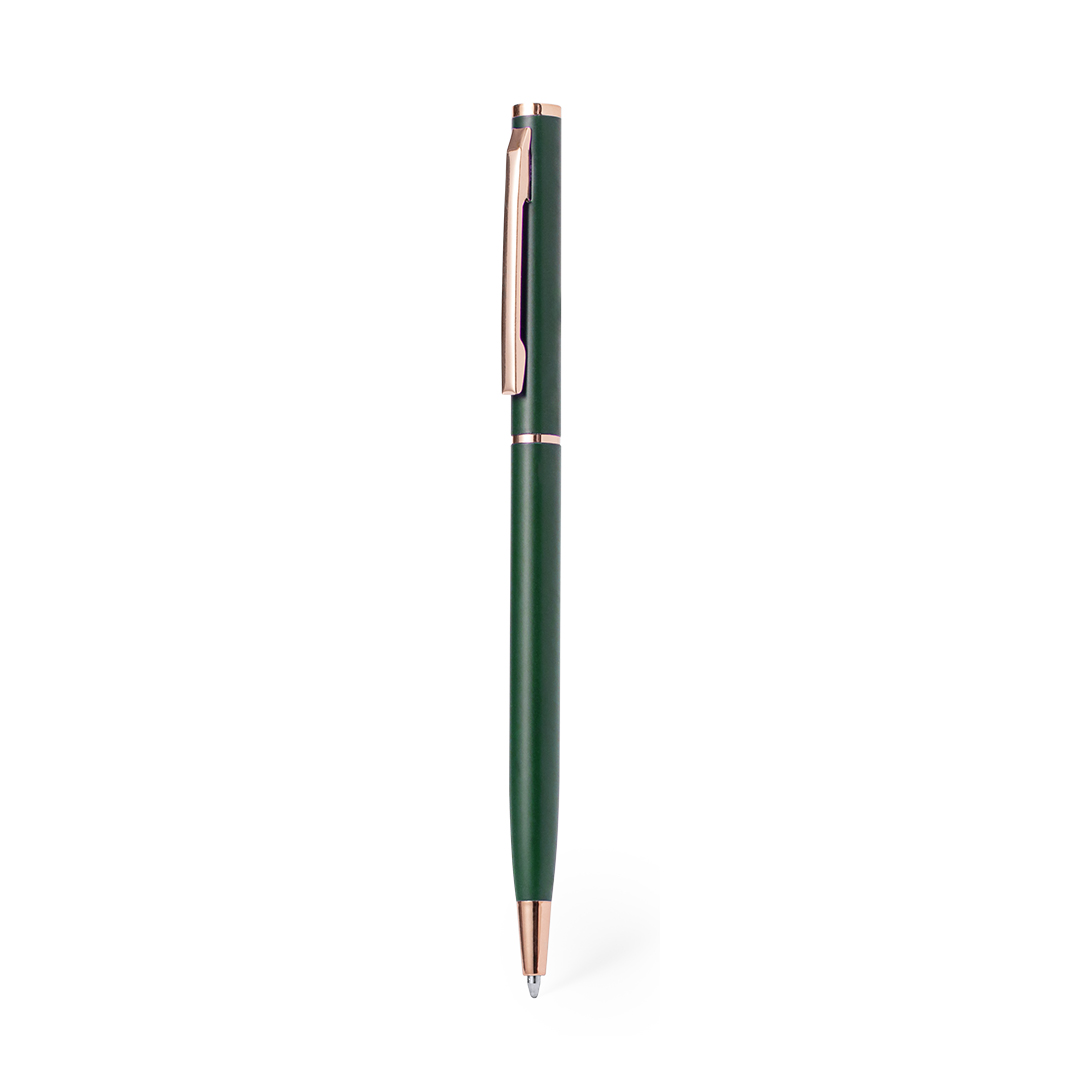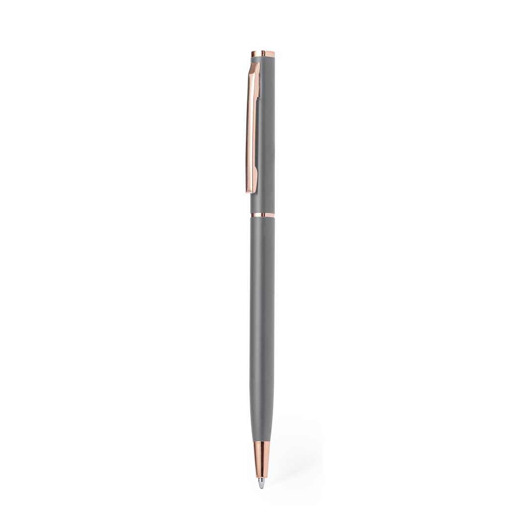 Excelente bolígrafo de aluminio con mecanismo giratorio. Cuerpo en resistente aluminio de acabado mate con elementos decorativos de elegante acabado color cobre, con la caña en una amplia gama de distintivos colores. Clip metálico y de tinta azul. Presentado en una bolsa individual reciclada.