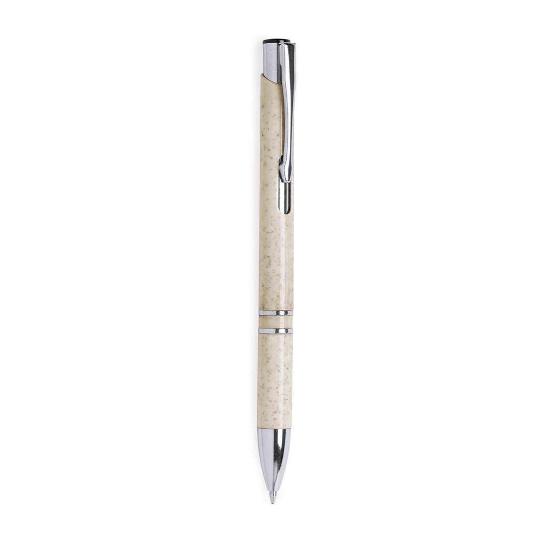 Bolígrafo de línea nature con cuerpo en caña de trigo, para así fomentar la utilización de materias primas naturales y reducir las emisiones contaminantes. Clip metálico y accesorios en cromado. De mecanismo pulsador, de cartucho jumbo y con tinta azul. Disponible en variada gama de colores nature.