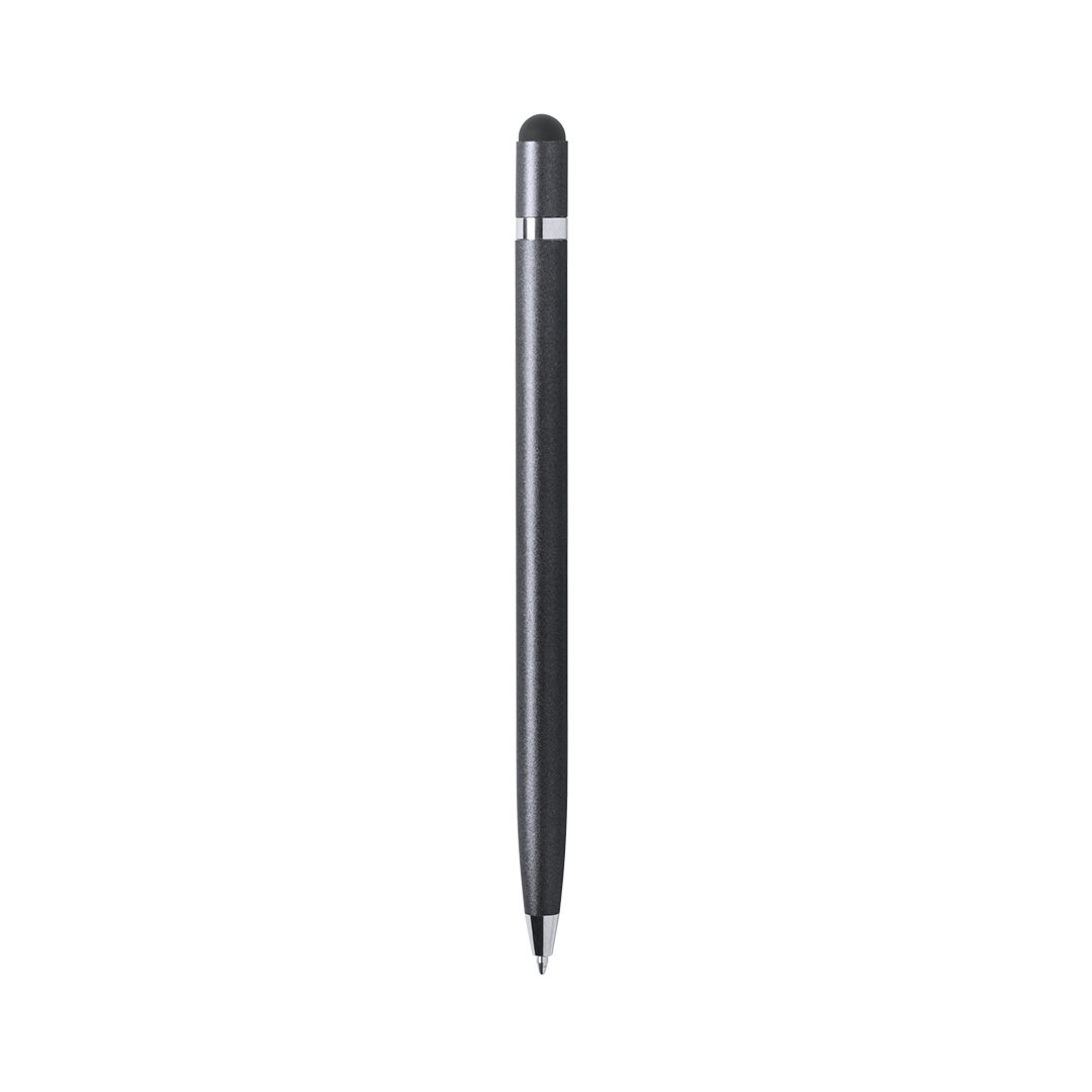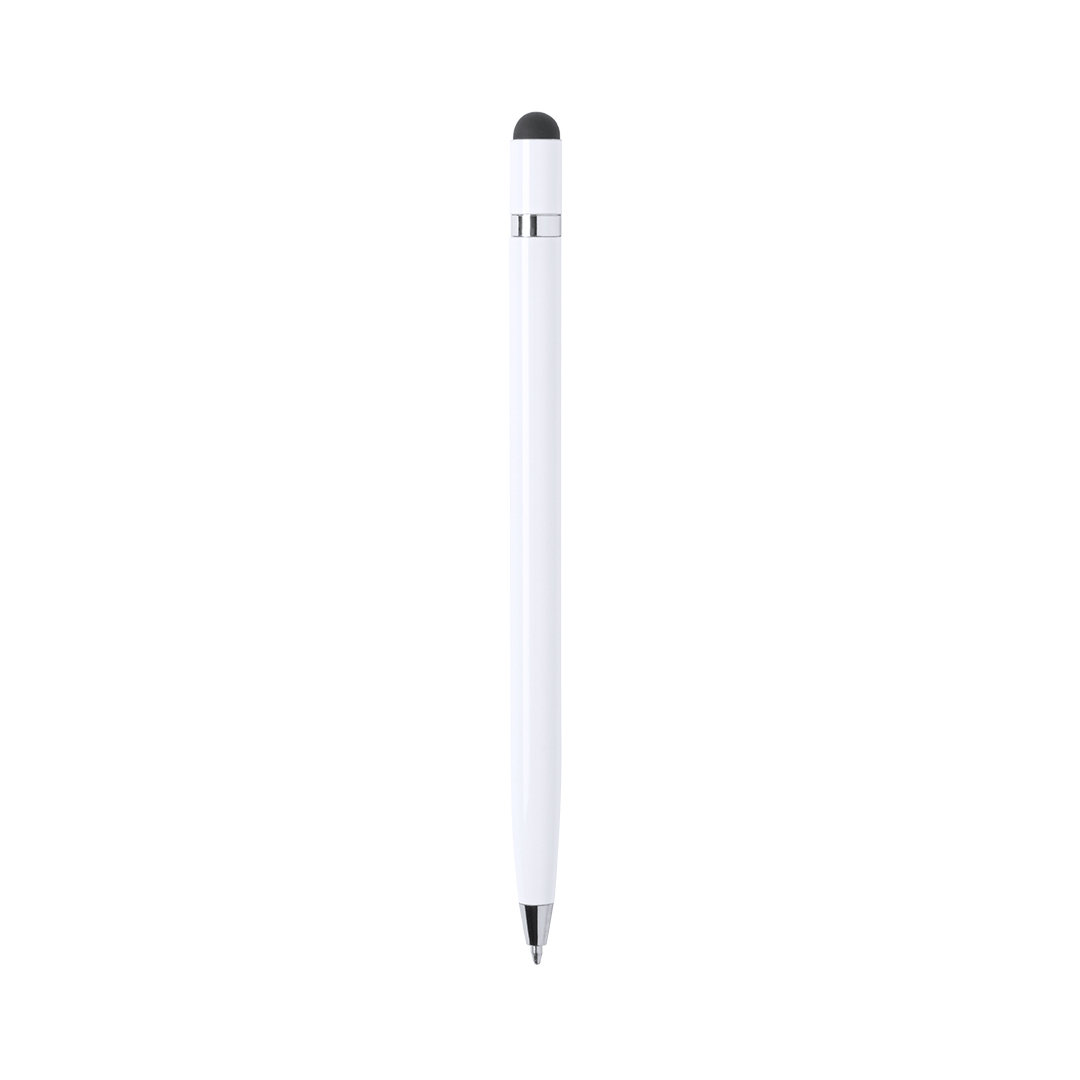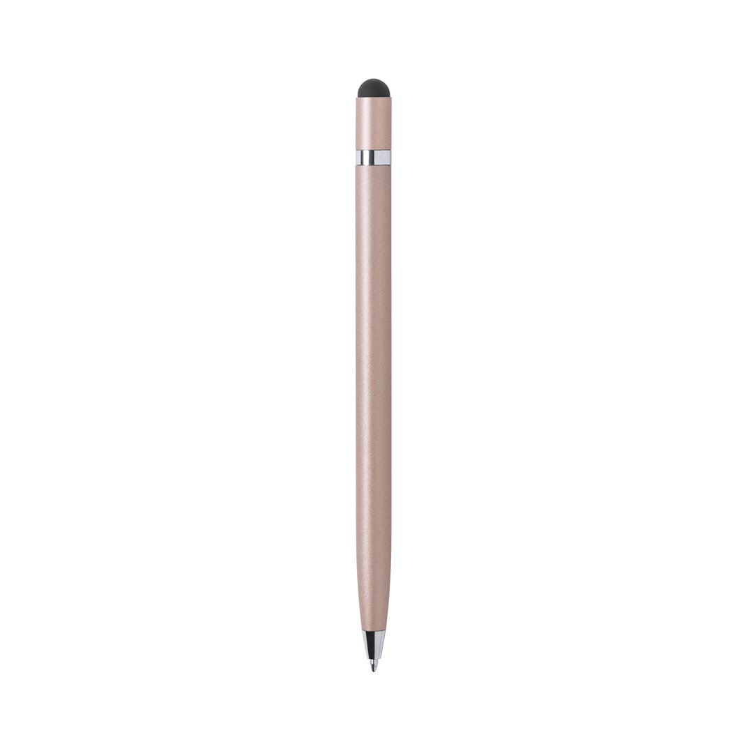Bolígrafo puntero de mecanismo giratorio con cuerpo en aluminio de suave acabado metalizado. Con anilla cromada. Colores dorado, rosa, plateado y grafito con acabado brillo y color blanco con acabado mate. Tinta azul.