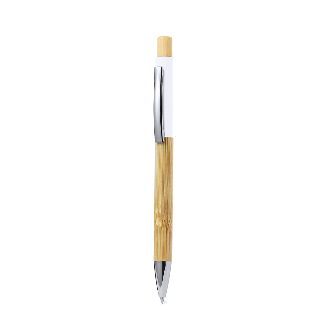 Elegante bolígrafo fabricado en bambú. Cuerpo en resistente aluminio de acabado goma y empuñadura en bambú, con la caña en una amplia gama de distintivos colores. Clip metálico, con mecanismo pulsador y en tinta azul. Presentado en bolsa individual reciclada.Materiales como el bambú fomentan la utilización de materias primas naturales, reduciendo las emisiones contaminantes. Proviene de una planta de gran resistencia y versatilidad, con crecimiento y regeneración rápidos, siendo una excelente alternativa al uso de madera tradicional.