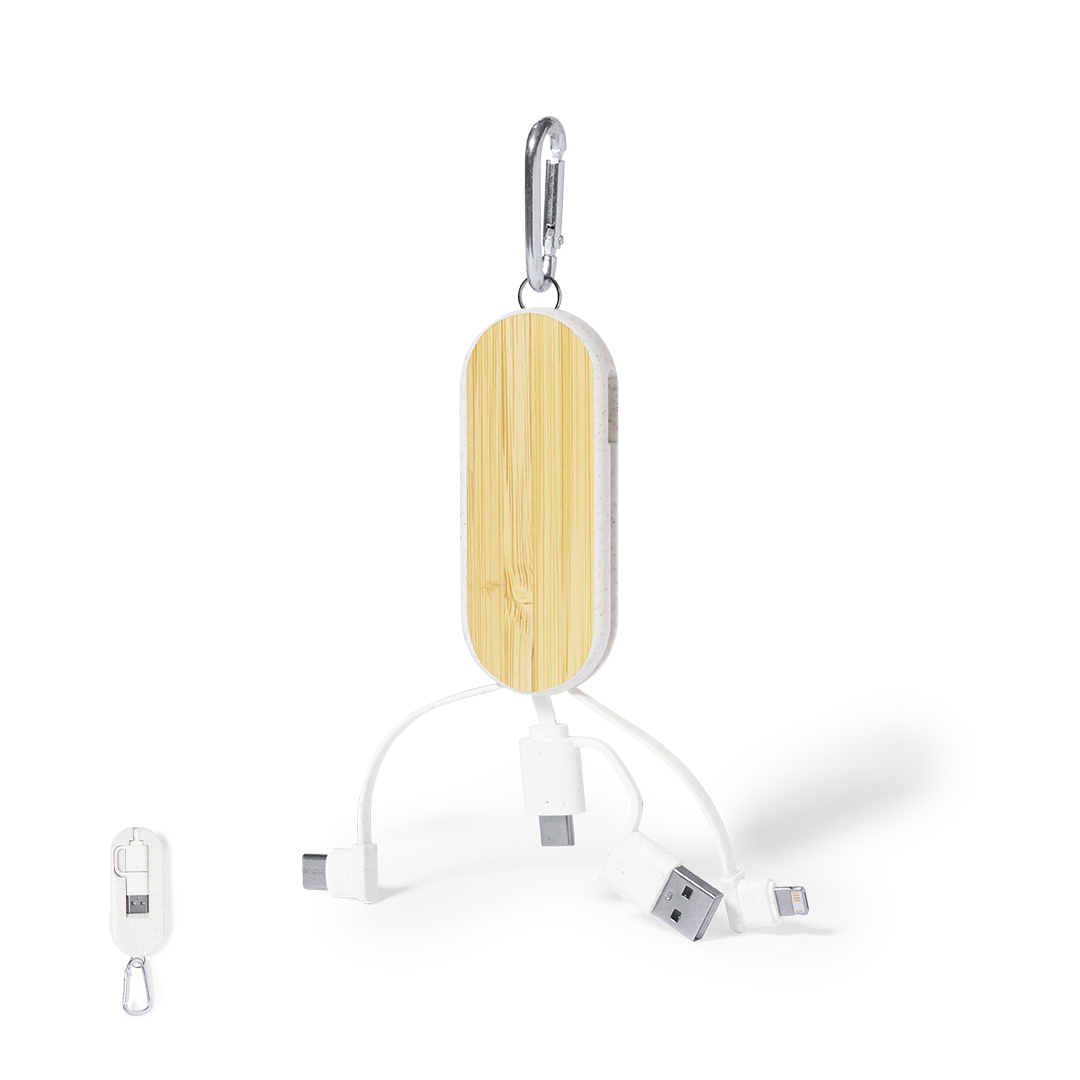 Cable cargador con mosquetón fabricado en fibra de trigo y bambú. Con conexiones de entrada Tipo C y USB y salidas Tipo C, lightning y Micro USB. 5V DC 2A. Presentado en bolsa individual de diseño kraft.Elaborado con elementos vegetales para así fomentar la utilización de materias primas naturales y reducir las emisiones contaminantes.