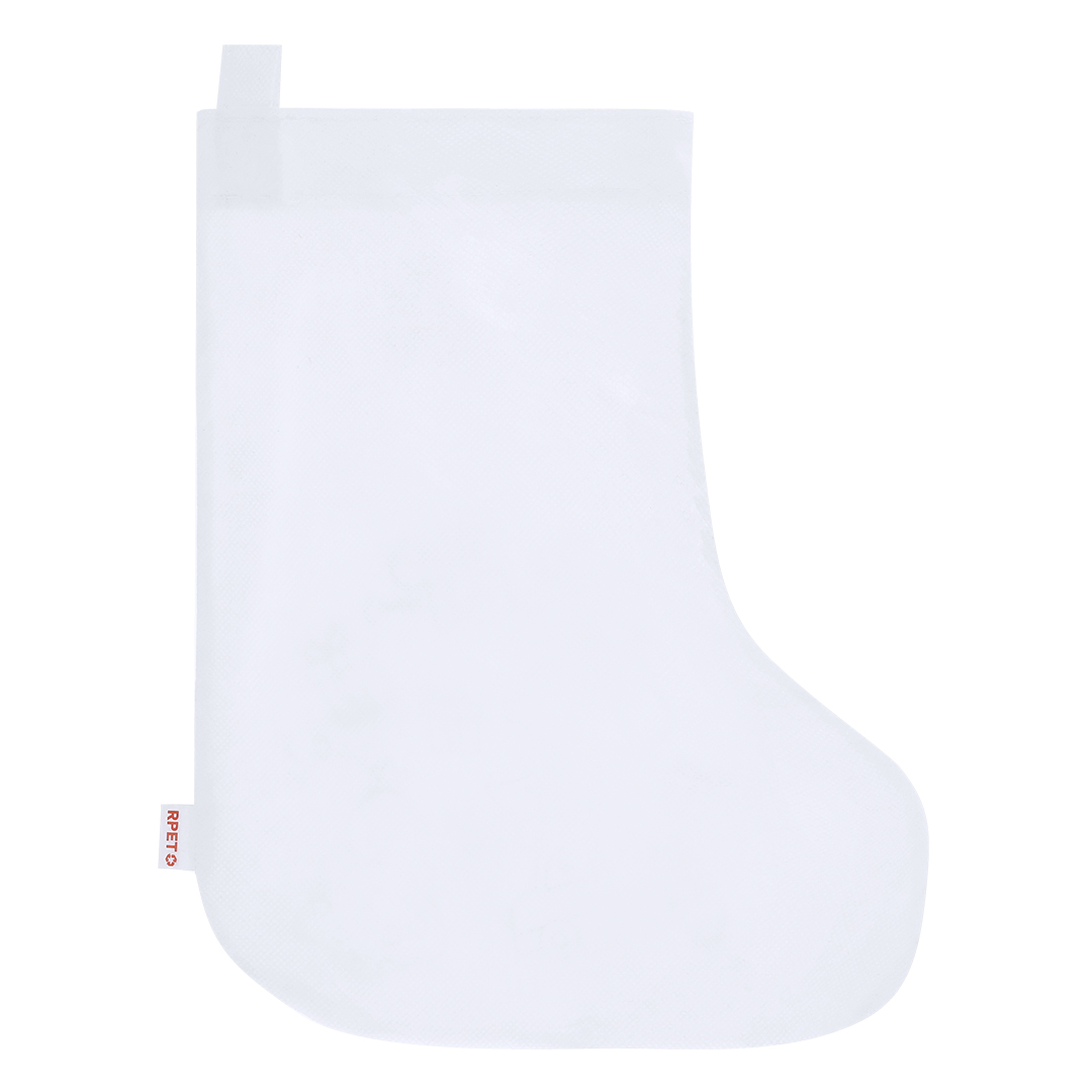 Calcetín de non-woven RPET en color blanco, especialmente diseñado para colorear con ceras. Diseño frontal de divertidos dibujos navideños, incluyendo 5 ceras en variados colores. Con cinta para colgar y de acabado termosellado. Incluye distintivo RPET en etiqueta.El material RPET se elabora a partir de plástico reciclado, para así fomentar la reutilización de residuos plásticos y ayudar a la sostenibilidad del planeta.