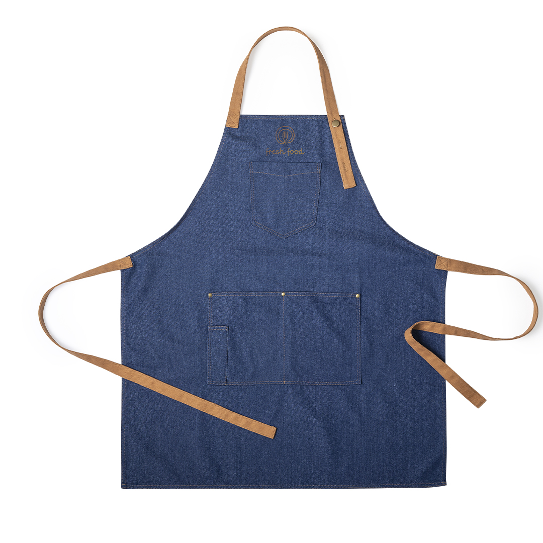Delantal de alta calidad en resistente tela de acabado denim. De corte por debajo de la rodilla, con cinta de cuello ajustable por botón, cintas para la cintura en color marrón, reforzadas. Incluye multitud de bolsillos para llevar cómodamente los distintos utensilios, con costuras reforzadas y remaches metálicos.