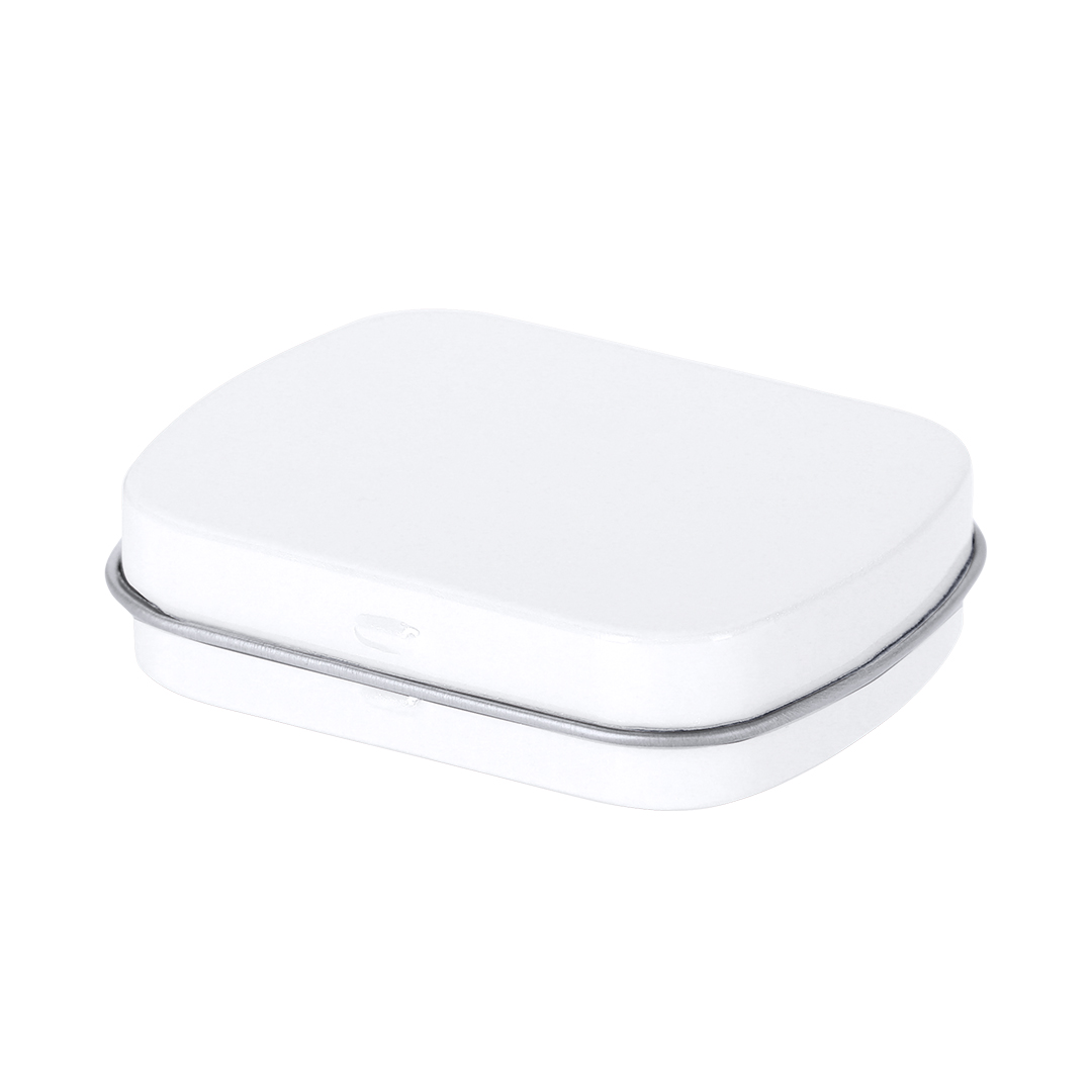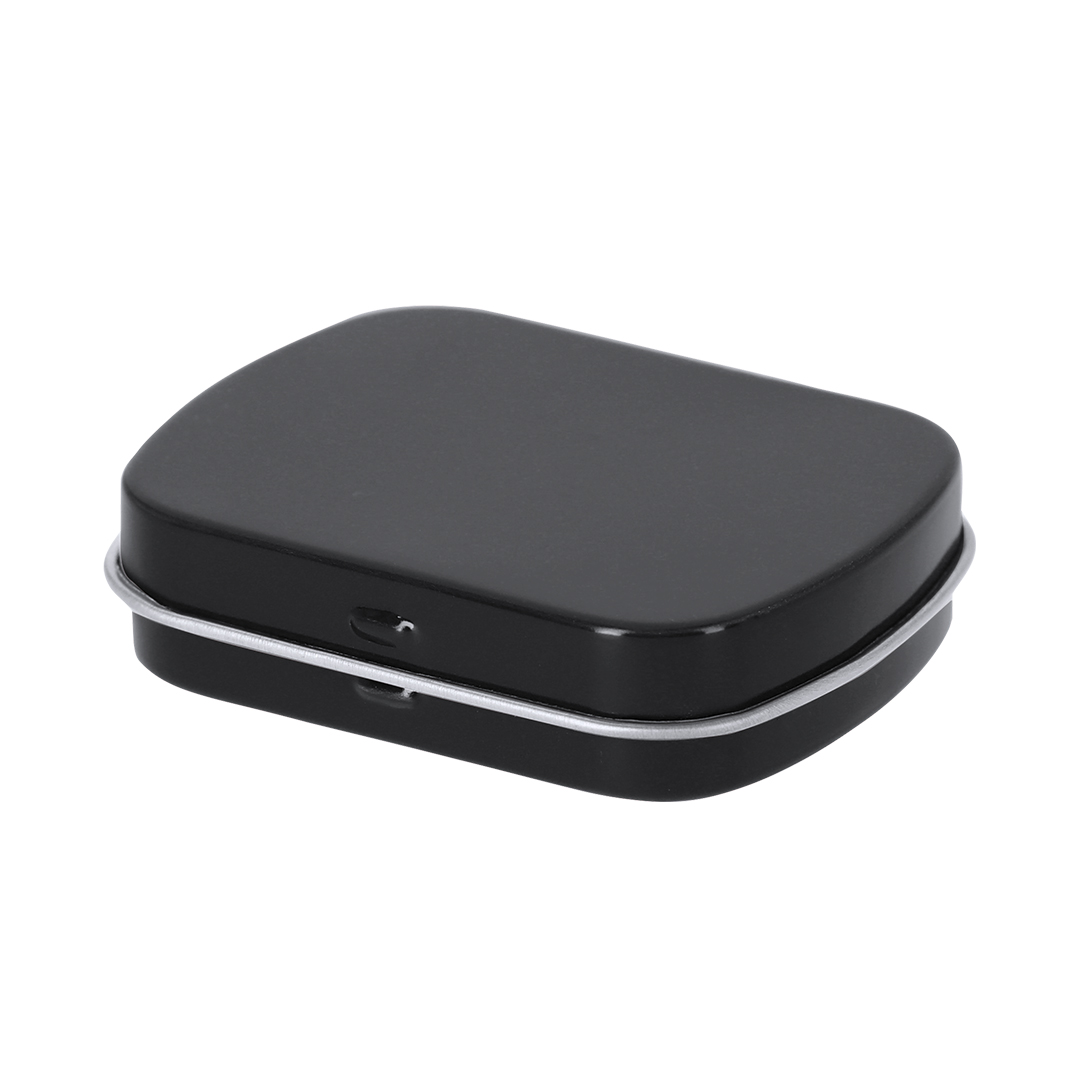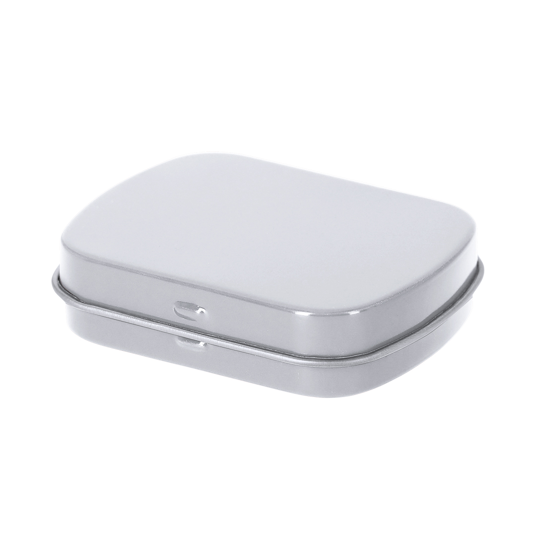 Dispensador de caramelos de menta sin azúcar de 23 gr. En caja de metal con sistema de apertura de bisagra.