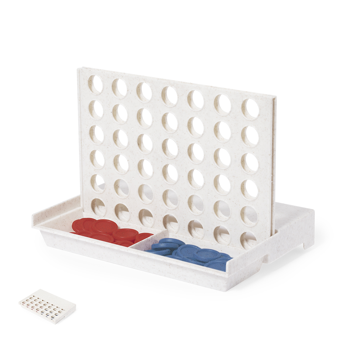 Divertido juego de mesa fabricado en caña de trigo. Compuesto por un tablero vertical y 42 piezas circulares (21 rojas y 21 azules). Emoción para todas las edades introduciendo las fichas por las ranuras para conseguir 4 fichas en 1 misma fila. Fácil de montar por su tablero móvil pudiendo desplegar o plegar. Presentado en caja de diseño kraft.