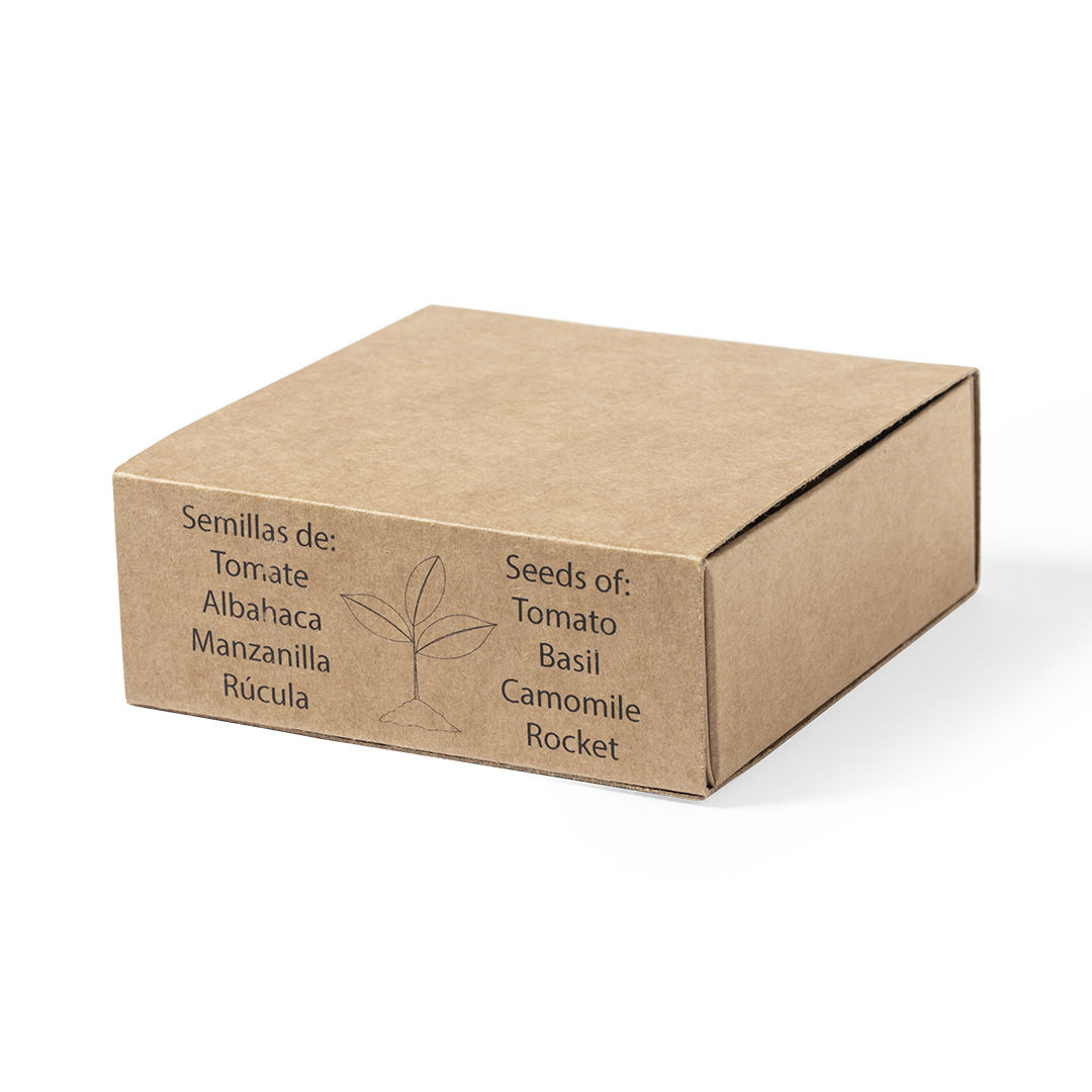 Kit huerto con semillas de tomate, albahaca, rúcula y manzanilla. Presentado en estuche de cartón reciclado con instruciones de plantado, distintivo Made in Europe y con 4 compartimentos independientes.