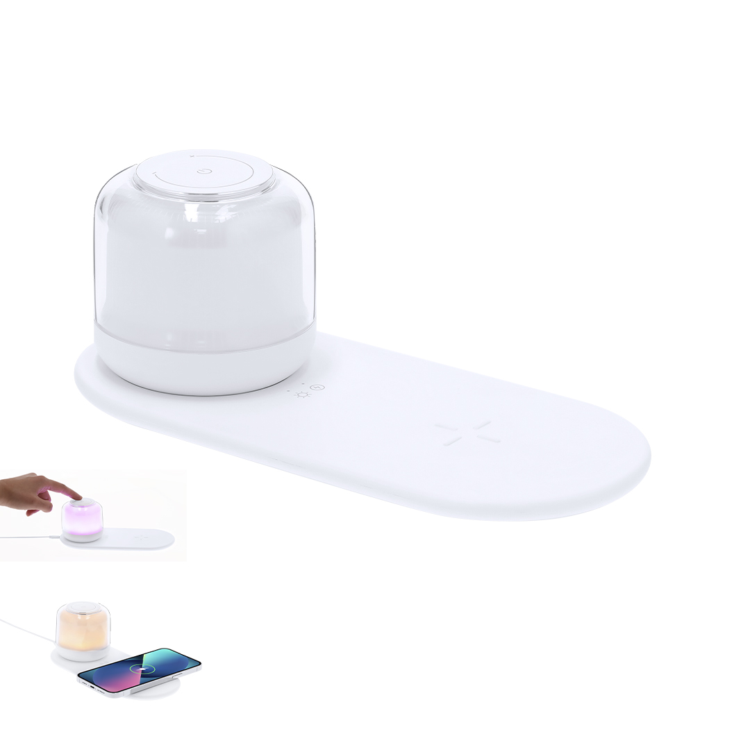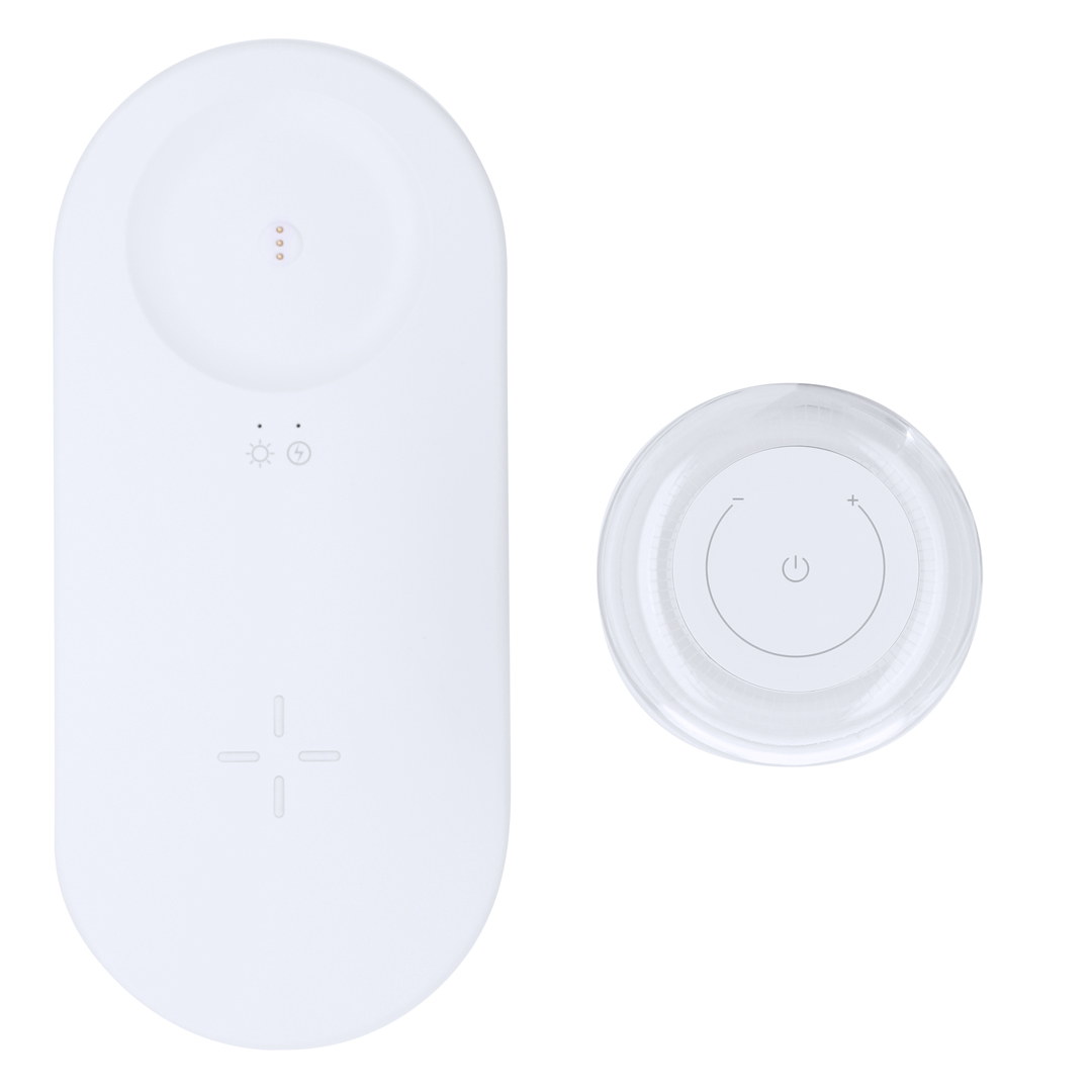 Lámpara multifunción. Incluye:- Lámpara portátil de carga inalámbrica de 12 LEDs. Con 2 posiciones de luz regulables por botones táctiles: luz blanca y multicolor. – Cargador inalámbrico de 15W.
