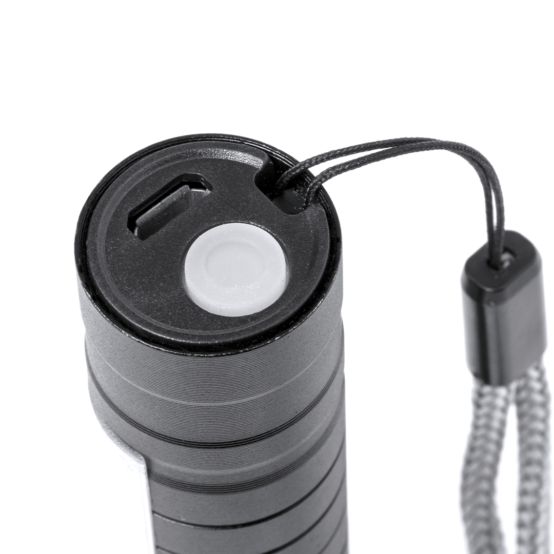 Potente linterna con batería recargable, fabricada en aluminio de acabado en color negro. Luz frontal con 1 LED y cabezal regulable, para tener un enfoque más focalizado o abierto. Además, cuenta con 10 luces COB en el mango y tres modos de iluminación (fija e intermitente de dos velocidades), incluye cinta de trasporte. Se alimenta mediante una batería recargable de 400 mAh, incluido cable micro USB. Presentada individualmente en caja de diseño.