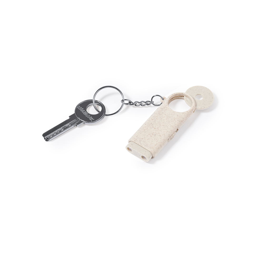 Llavero moneda con linterna integrada, fabricado en caña de trigo y ABS. Con práctica moneda, 2 LEDs y alimentación a pilas (de botón incluidas). Con distintivo Wheat Straw y presentado en bolsa individual reciclada.Elaborado con elementos vegetales para así fomentar la utilización de materias primas naturales y reducir las emisiones contaminantes.
