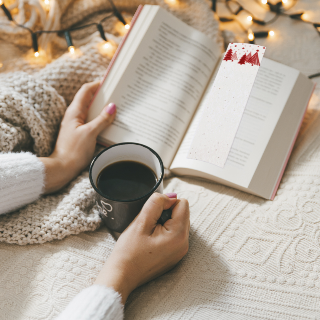 Marcapáginas de diseño navideño fabricado en papel de semillas. El papel incluye semillas de petunia, convirtiéndolo en papel plantable al final de su vida útil. Incluye instrucciones de plantado en la cubierta trasera y amplia superficie de marcaje.