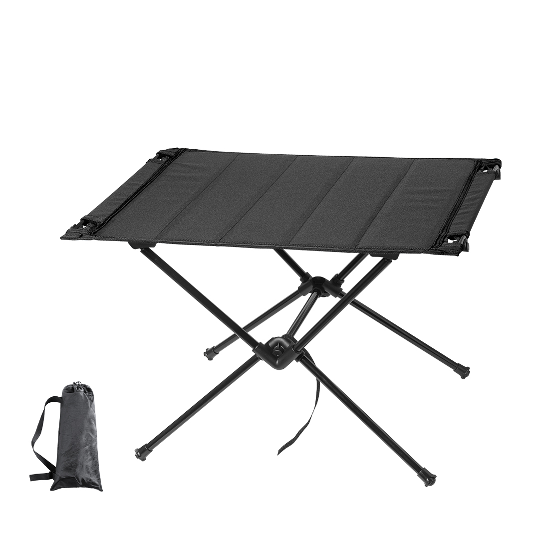 Mesa plegable con resistente cuerpo de metal tubular y superficie en resistente poliéster 600D. Con costuras reforzadas y refuerzos antideslizantes en las patas. De fácil plegado y tamaño compacto, presentada en funda individual.