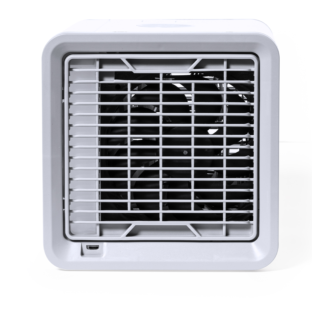 Mini dispositivo portátil de aire acondicionado para enfriar y purificar el aire. Al ser pequeño y ligero, es fácilmente transportable. Ventilador con tres velocidades a elegir (alta, media, baja). Incluye un depósito de agua de gran capacidad -700 ml-, con posibilidad de añadir cubitos de hielo para conseguir un aire más fresco alrededor. Se conecta a la corriente eléctrica a través de un cable de alimentación USB -incluido- y viene presentado individualmente en caja de diseño kraft. Disponible manual de instrucciones en español e inglés.