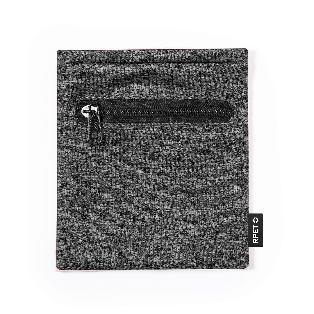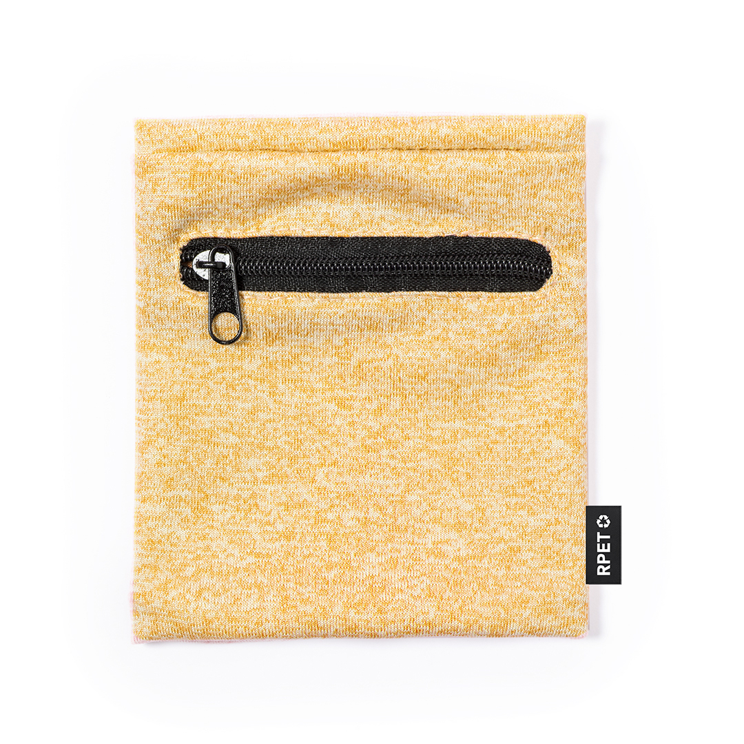 Práctica muñequera en suave poliéster RPET. Complemento perfecto para guardar pequeños objetos gracias a su bolsillo con cierre de cremallera negra. Disponible en variada gama de colores, con etiqueta distintiva RPET.El material RPET se elabora a partir de plástico reciclado, para así fomentar la reutilización de residuos plásticos y ayudar a la sostenibilidad del planeta.