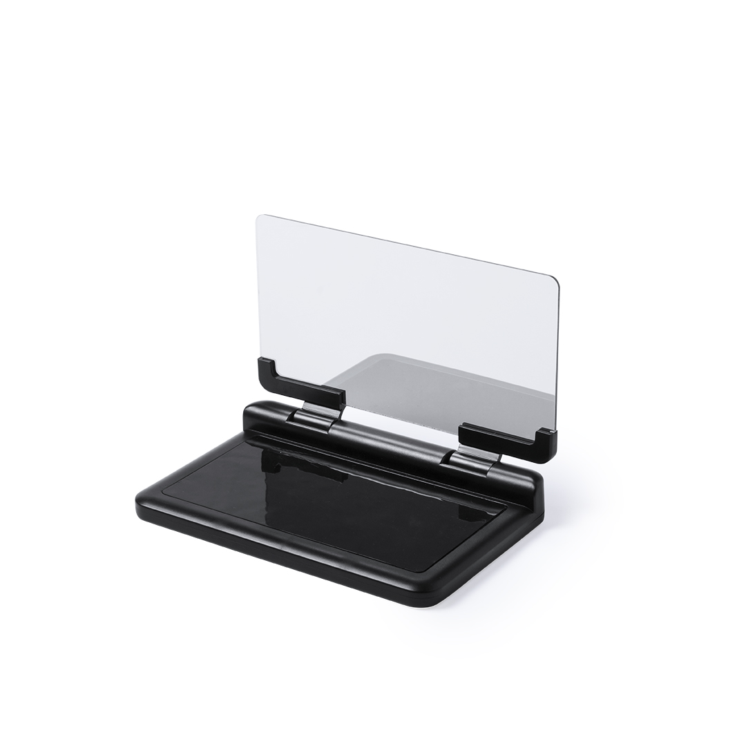 Pantalla soporte para automóvil. Con espejo duplicador de imagen ajustable y superficie anti deslizante ultra adherente para salpicadero y smartphone. Presentado en atractiva caja de diseño.