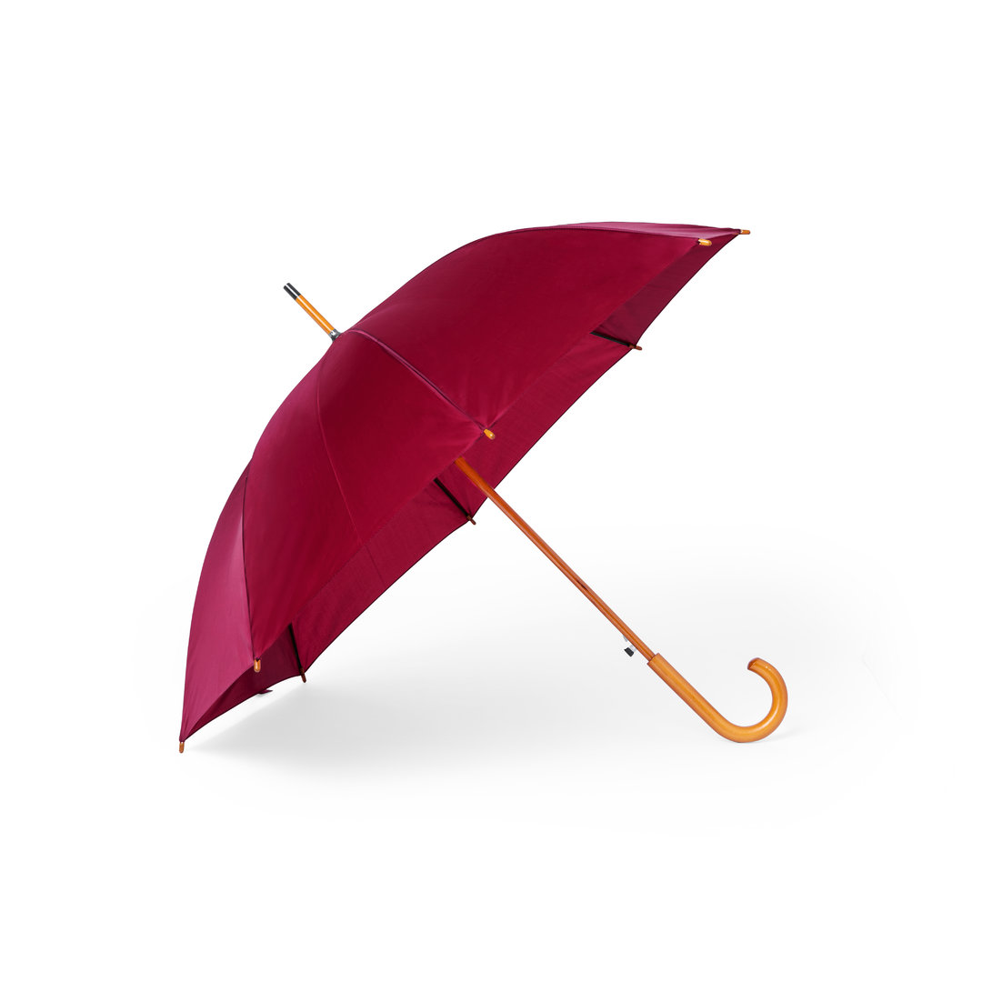 Paraguas de 8 paneles y 105 cm de diámetro, en resistente material poliéster 190T. De apertura automática, con mango curvado y caña, ambos en madera. Varillas metálicas en color negro, tira con cierre de velcro y disponible en variada gama de colores.