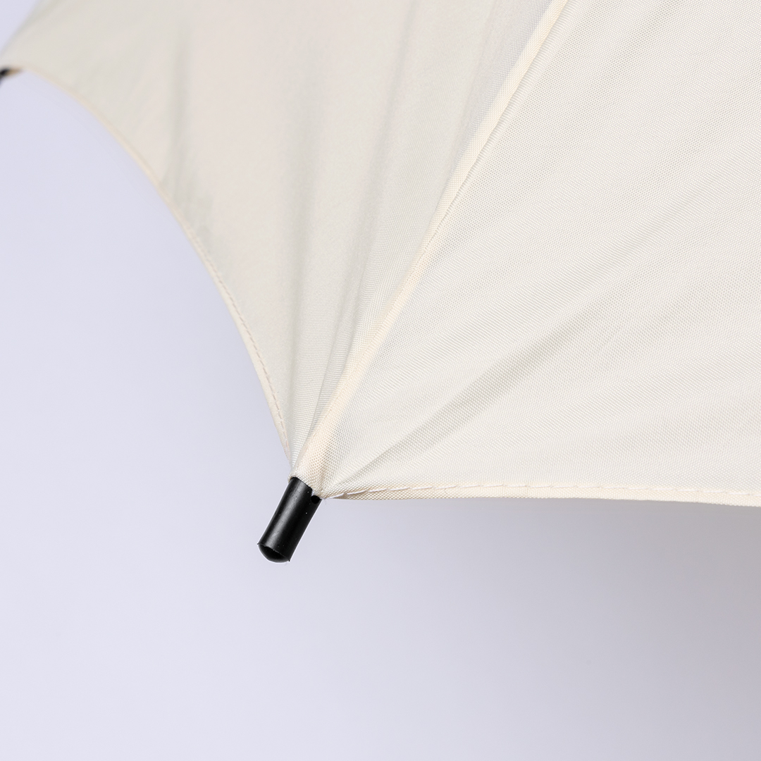 Paraguas de 8 paneles tamaño XL -130 cm diámetro-, fabricado en resistente material pongee 190T de acabado natural. De apertura automática y con mecanismo antiviento. Varillas de fibra en color negro, con mango recto de madera y cierre de velcro