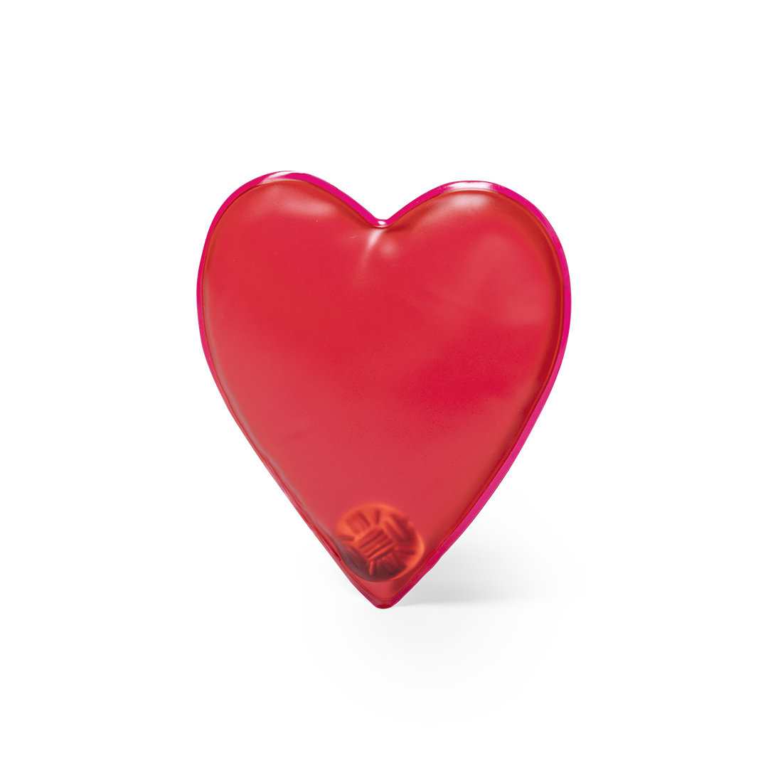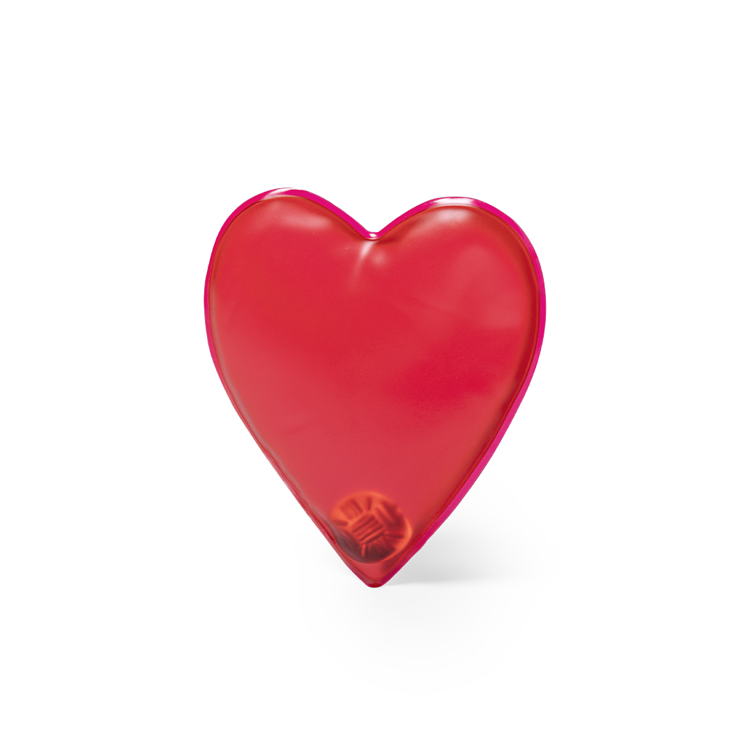 Parche térmico con diseño corazón. Reutilizable y con efecto calor de duración prolongada. Se activa doblando la chapa metálica para que el parche se endurezca y se caliente. Para reutilizar, se calienta agua en un recipiente con el parche dentro hasta que el gel interior vuelva a su estado líquido, presionando la chapa metálica de nuevo. Disponible manual de instrucciones en español e inglés.