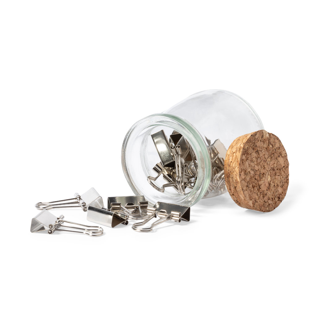 Portaclips fabricado en resistente cristal transparente, con original diseño vintage y tapón en corcho natural. Incluidos 15 clips metálicos, presentado en caja individual de cartón kraft.