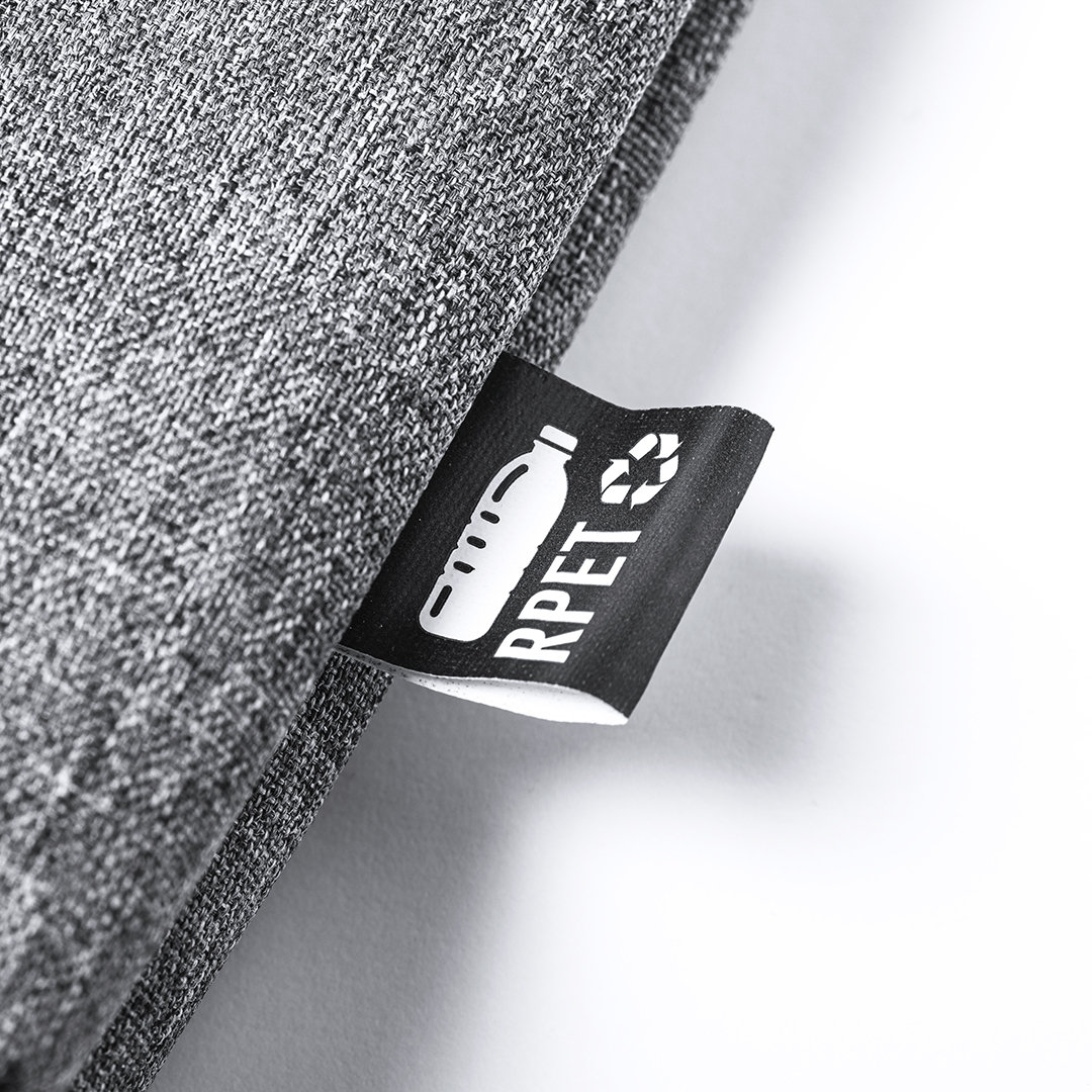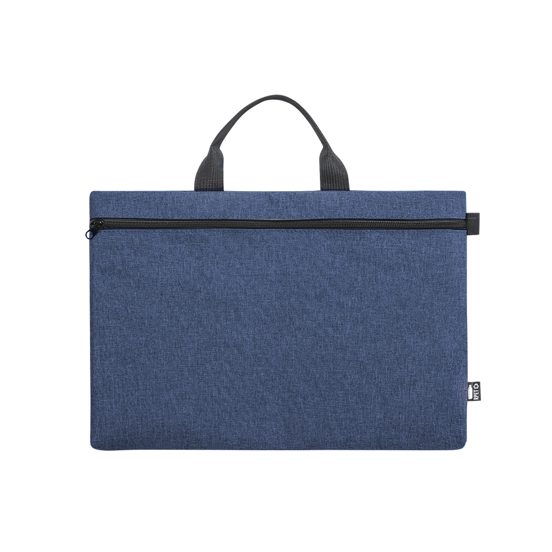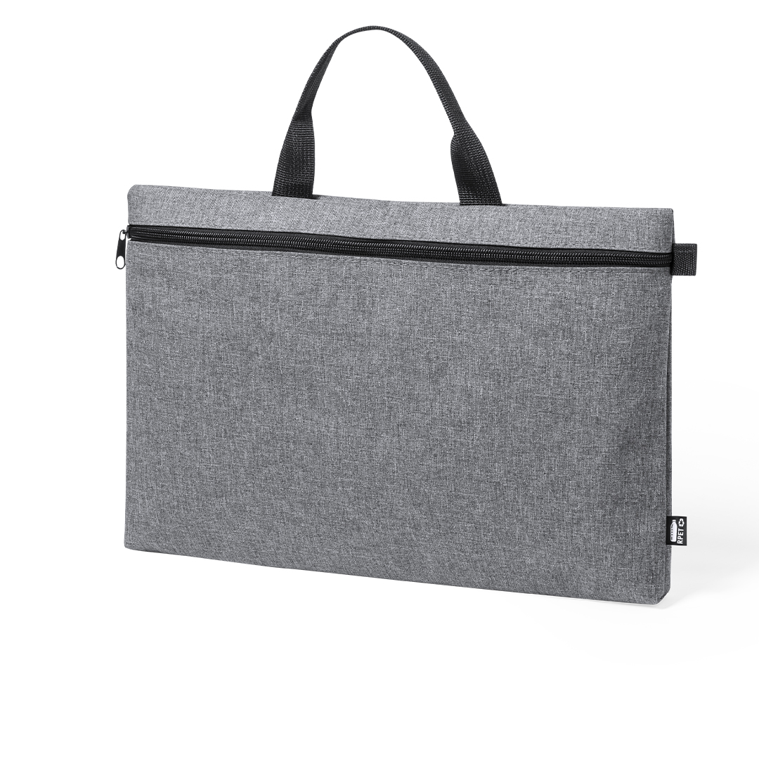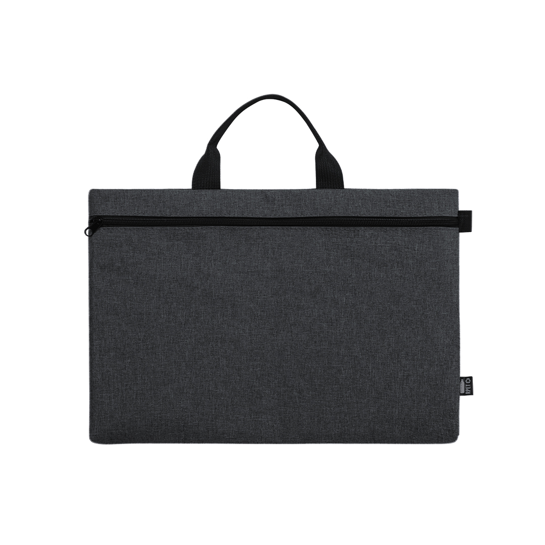 Portadocumentos de línea nature y en resistente 600D RPET efecto melange, elaborado a partir de plástico reciclado para así fomentar la reutilización de residuos plásticos y contribuir a la sostenibilidad del planeta. Detalles en negro y compartimento principal con cierre de cremallera. Resistentes asas a juego y distintivo RPET en etiqueta exterior.