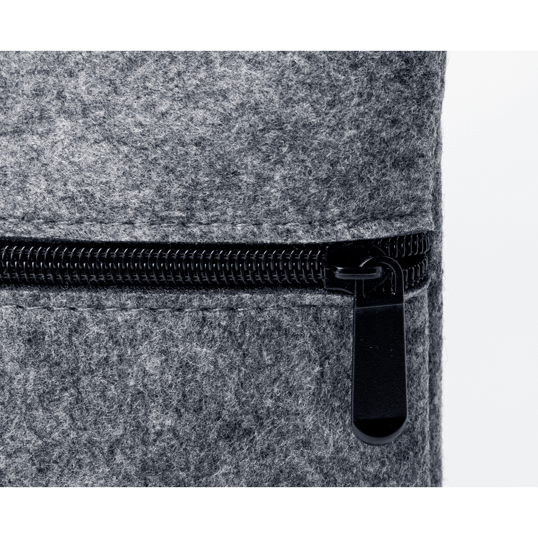 Portadocumentos en resistente fieltro RPET efecto melange. Compartimento principal con cierre de cremallera, para ordenador portátil de hasta 15 pulgadas, y pequeño bolsillo interior. Con resistentes asas a juego con detalles en negro. Logotipo RPET en etiqueta exterior. El fieltro RPET es fruto de la combinación del proceso de reciclaje de materiales plásticos junto con la técnica milenaria de fabricación del fieltro, dando como resultado un material de eco-tendencia que, además de ser de origen reciclado, también se convierte en reciclable.