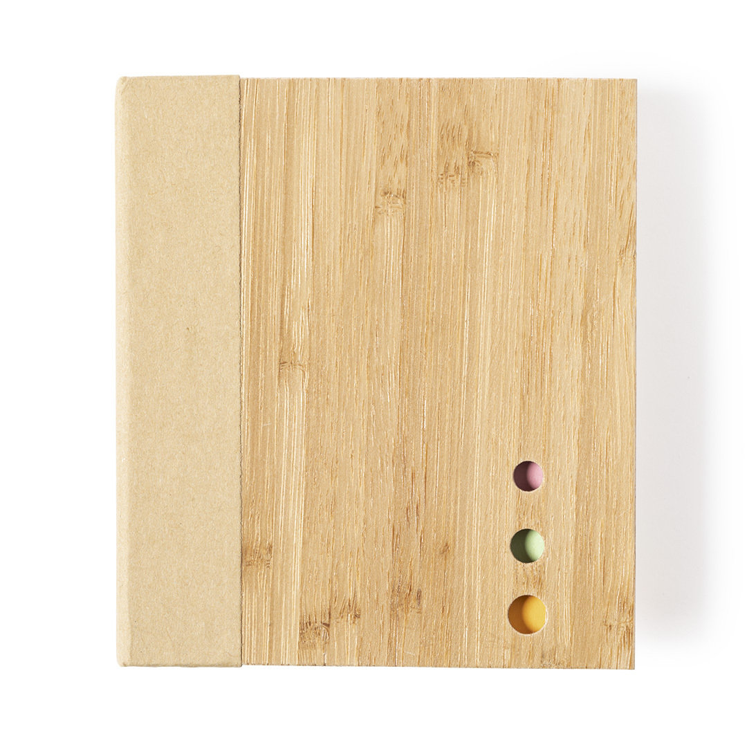 Portanotas de linea nature con tapas rígidas de bambú. Con 115 hojas adhesivas de acabado kraft, 115 hojas adhesivas medianas y 420 mini notas adhesivas.