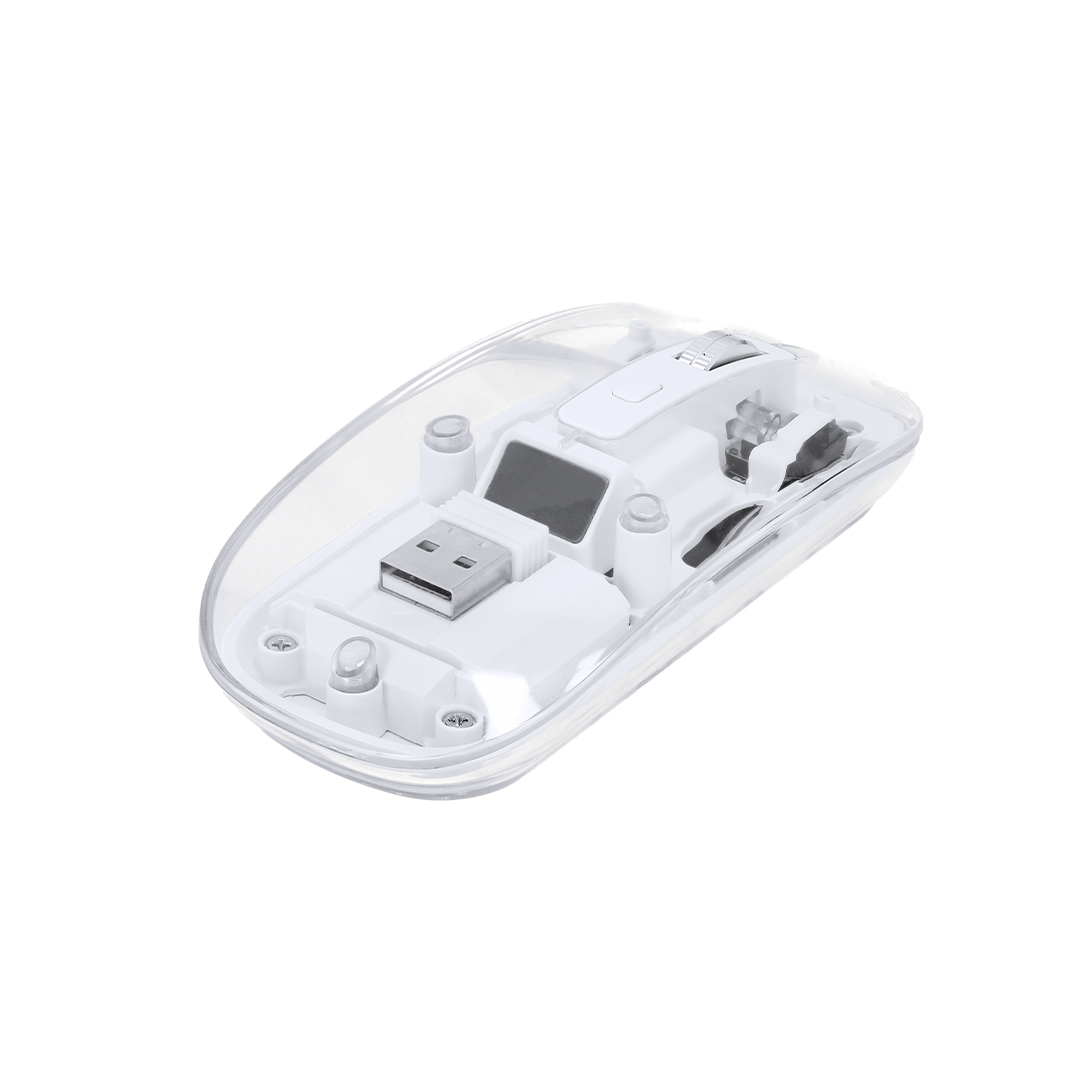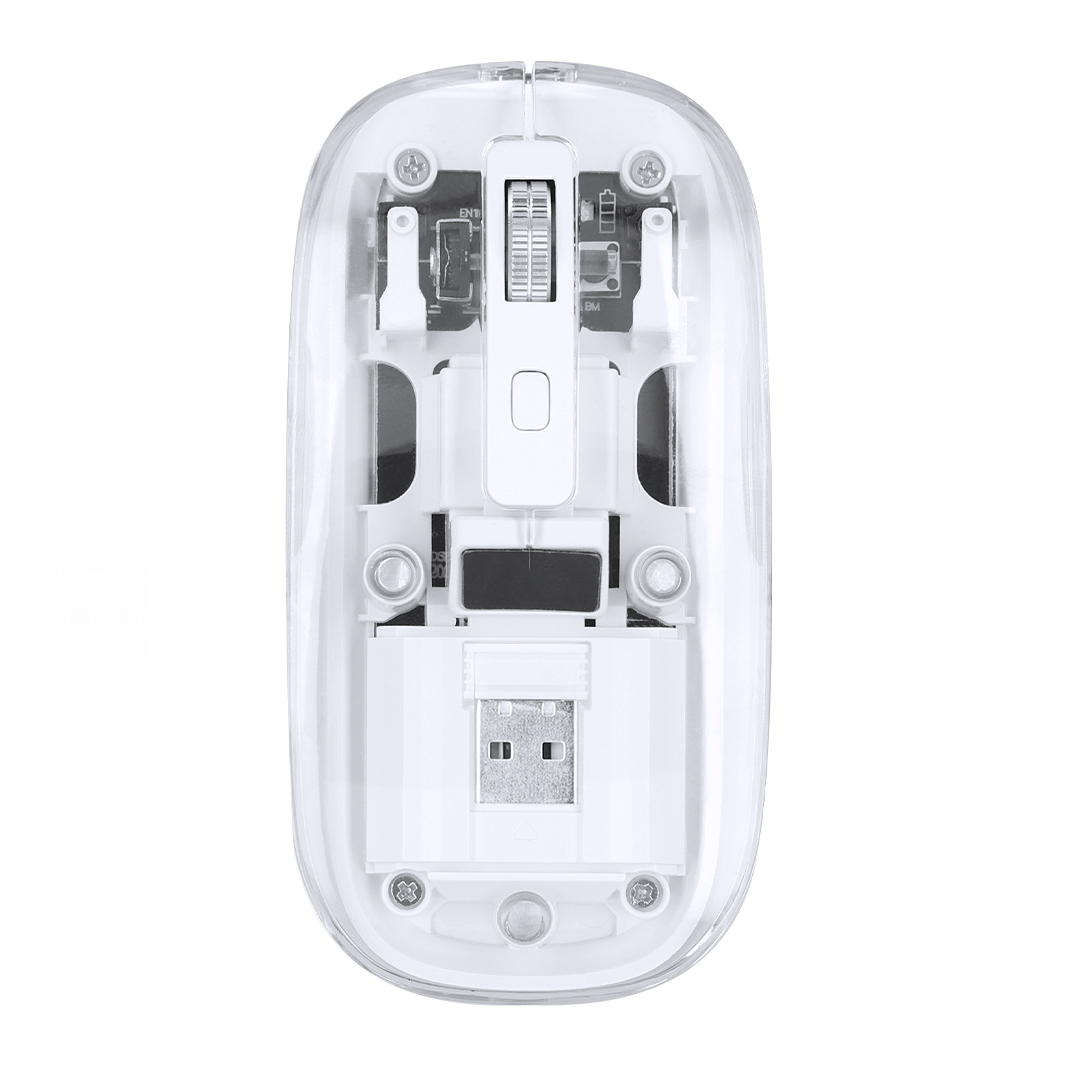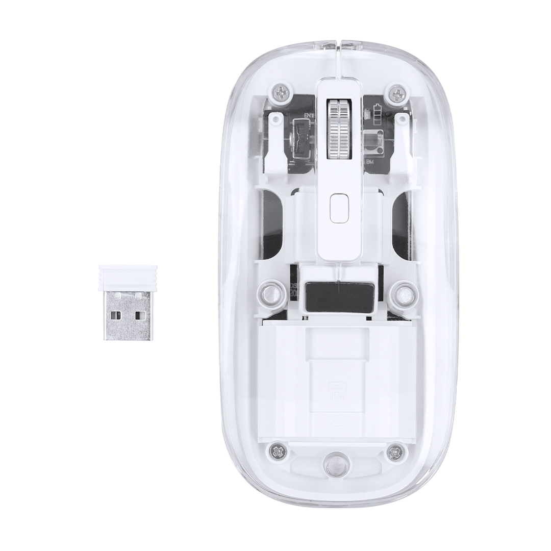 Ratón óptico inalámbrico de original diseño, con cuerpo transparente que permite ver los componentes internos del dispositivo. Con batería integrada de 300 mAh y con puerto de carga Tipo C (cable incluido). Incluye botón DPI, con conexión “plug and play” por USB y viene presentado en caja individual de diseño kraft.