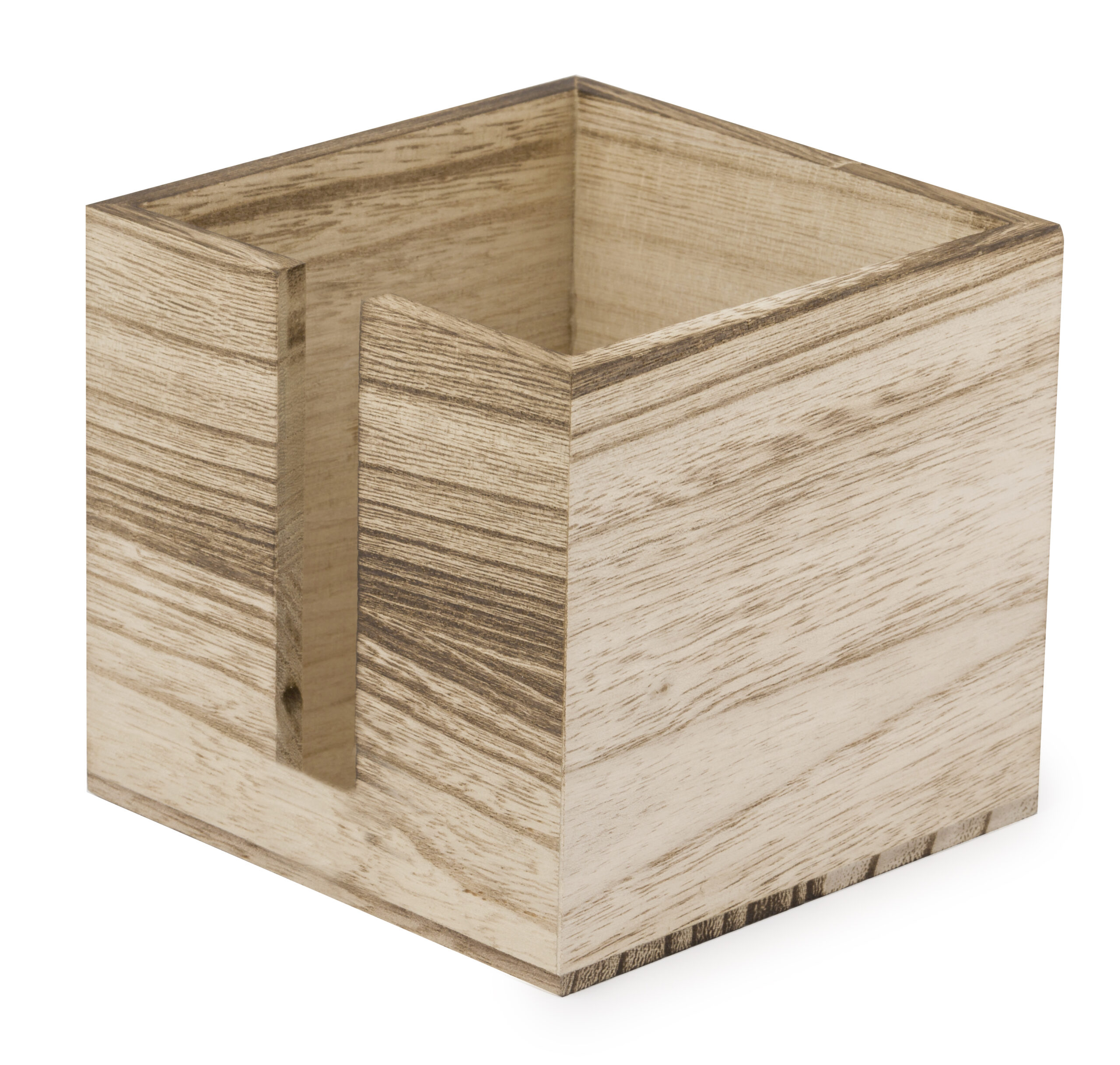 Práctico servilletero fabricado en madera. De diseño industrial, fabricado en suave madera natural con ranura en un lateral para poder coger las servillas con facilidad. Presentado en caja de diseño kraft.