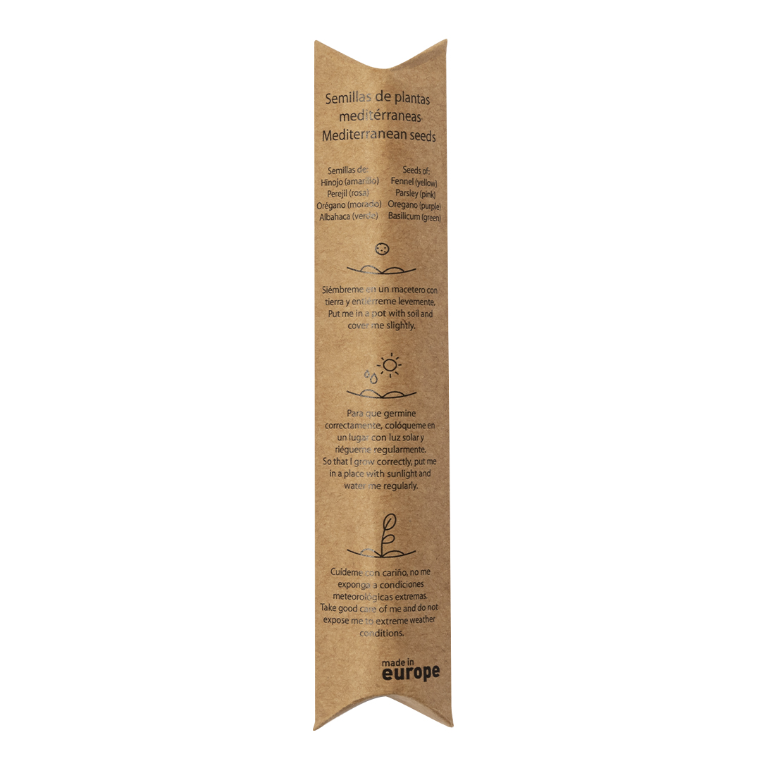 Set de bombón con semillas presentado en recipiente de plástico con tapón de corcho. Este kit de huerto contiene semillas de albahaca, hinojo, perejil y orégano. Presentado y protegido dentro de un sobre de cartón reciclado con instrucciones de plantado.