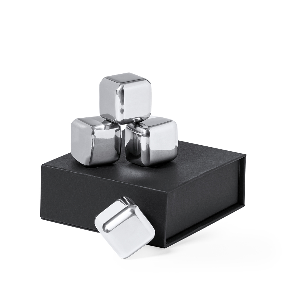 Set de 4 cubitos reutilizables. Fabricados en acero inoxidable, manteniendo la bebida fría sin alterar sus propiedades al no diluir su contenido en agua, además de mantener el sabor original de la misma. Presentados en elegante estuche color negro con interior troquelado.